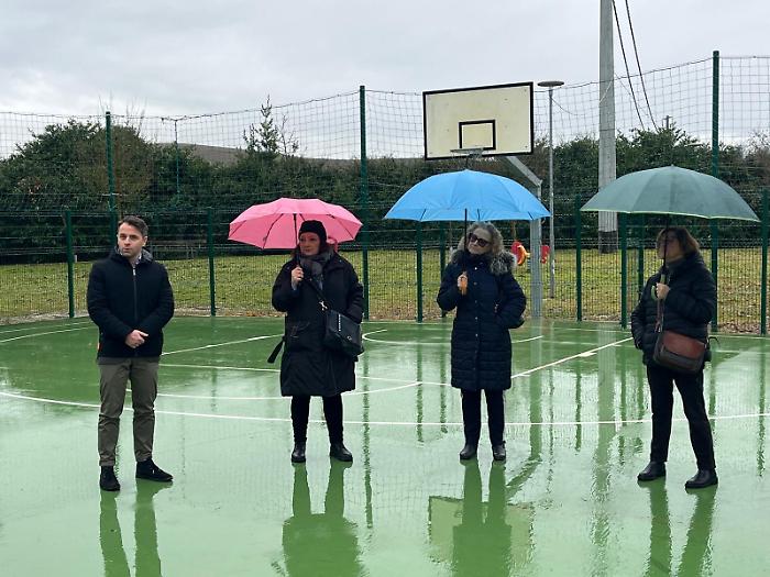 L’impianto, precedentemente malconcio e non più sicuro, ha beneficiato di un intervento di riqualificazione finanziato con 150 mila euro provenienti dai fondi Pnrr Next Generation. Durante i lavori, sono stati rimossi la vecchia recinzione in tubolari di ferro e la pavimentazione in mattonelle di graniglia. È stata quindi realizzata una nuova pavimentazione con sottofondo bituminoso e uno strato di finitura in resina acrilica, adatta a diverse discipline sportive, tra cui calcetto e basket. La recinzione è stata sostituita con pannelli in rete elettrosaldata, garantendo sicurezza e funzionalità.