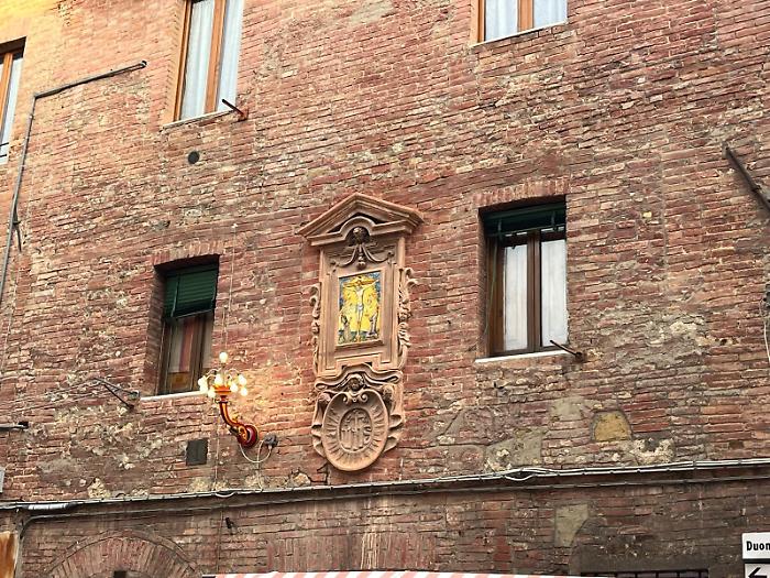 Un'altra curiosità per gli amanti dell'arte e della storia senese: quando uscite dalla chiesa e vi incamminate lungo Pian dei Mantellini, alzate gli occhi nel Palazzo di destra, nei pressi del civico 59. Vedrete un bellissimo tabernacolo, recentemente restaurato dai condomini. La parte in ceramica è opera del grande Dino Rofi che proprio nello stabile di fronte (dove oggi c'è il Carrefour) aveva la sua storica bottega.