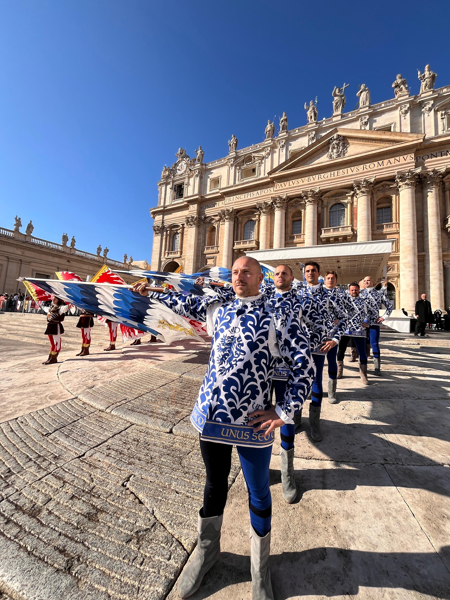 Una giornata di grazia e orgoglio per il patrimonio culturale toscano e italiano: il Quartiere Canneti di San Quirico d’Orcia ha partecipato ieri al pellegrinaggio giubilare delle rievocazioni storiche italiane, culminato con l’udienza concessa da Papa Leone XIV in Piazza San Pietro. In un’atmosfera di profonda commozione e unità, gli sbandieratori biancazzurri, tamburini, alfieri e contradaioli del Quartiere – più di venti monturati in abiti storici – hanno portato il loro spettacolo di alfieri e tamburini al cospetto del Santo Padre, rappresentando con fierezza la tradizione della bandiera e della Toscana intera. Agli alfieri cannetini l’onore di accompagnare con le bandiere l’ingresso del Santo Padre in piazza.