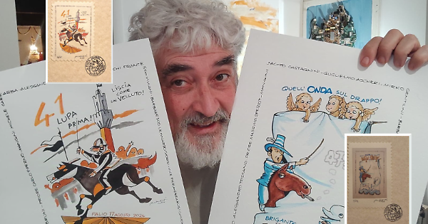 Alvalenti colpisce ancora. A pochi giorni dal Natale, il poeta graficomico propone, come tutti gli anni, i suoi particolari francobolli, impreziositi dall'annullo/timbro delle “poste senesi” della sua Città Magica. In genere, l'artista offre, in una forma particolare (con i nomi di tutti i protagonisti, dal capitano al barbaresco e i suoi vice passando da priore e mangini), le vignette preparate per le vittorie del Palio e pubblicate sul Corriere di Siena il giorno in cui si celebra il rispettivo trionfo. Questa volta, però, ha cambiato qualcosa nella tradizione, e se per l'Onda l'immagine è proprio quella affidata alle pagine del quotidiano in edicola il 5 luglio 2024, per la Lupa è diversa da quella vista il 18 agosto 2024. Un colpo a sorpresa.