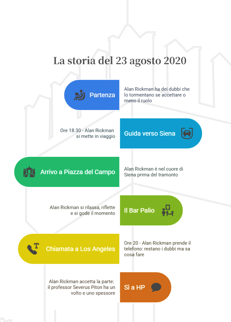 Alan Rickman, il celebre attore inglese noto per il suo ruolo indimenticabile del professor Severus Piton nella saga cinematografica di Harry Potter, ha scelto Siena e lo scenario di piazza del Campo al tramonto per fare chiarezza in se stesso se fosse il caso di accettare o meno il ruolo che gli era stato proposto, e che lui ha reso indimenticabile.