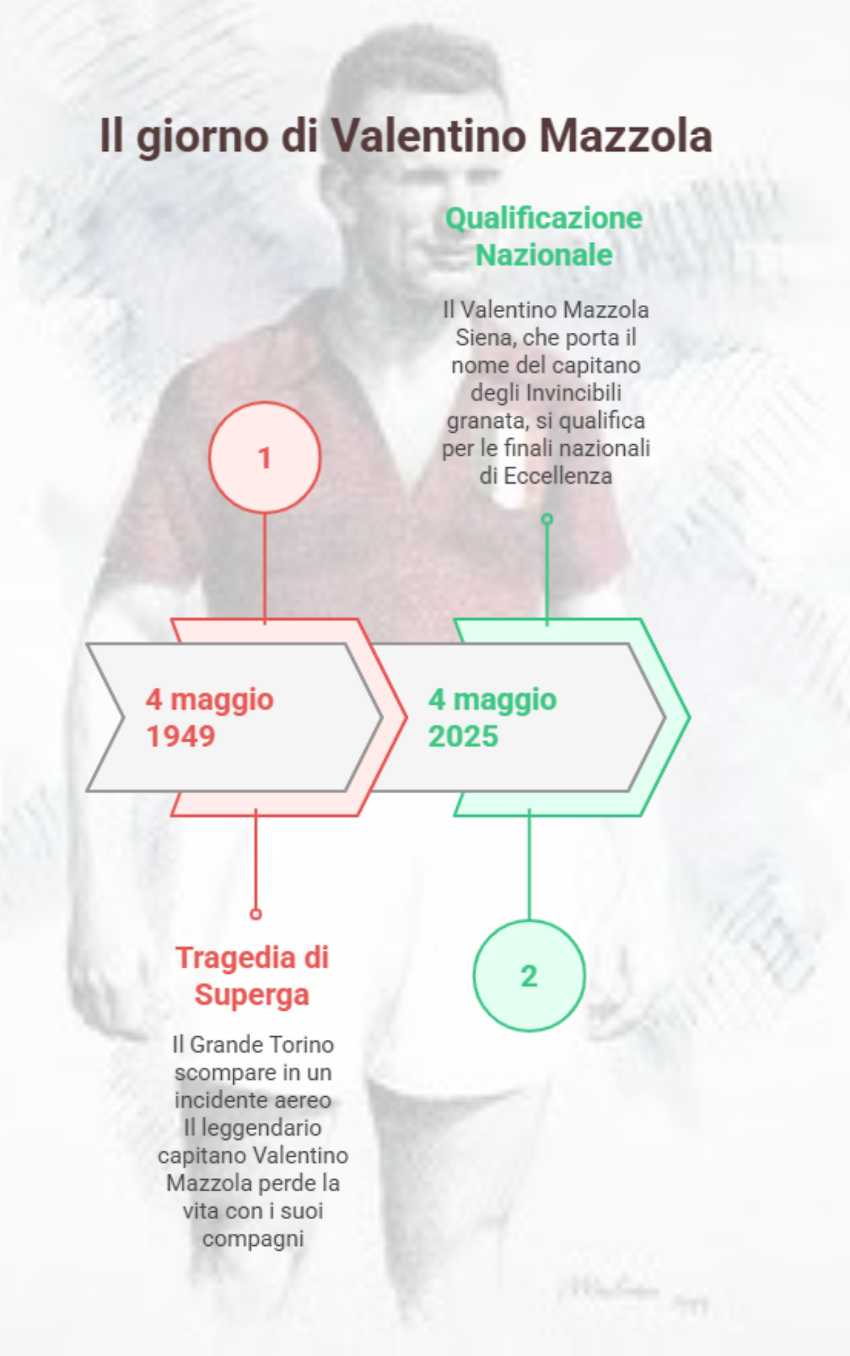 Proprio nel giorno in cui tutto il mondo del calcio si ferma per ricordare il Grande Torino, scomparso tragicamente nel disastro aereo di Superga il 4 maggio 1949, il Valentino Mazzola, che porta il nome del mitico capitano granata di quello squadrone di invincibili, vive la pagina più bella della sua storia sportiva. Con grinta, cuore e sofferenza, la squadra senese conquista sul campo il pass per le finali nazionali di Eccellenza, dove affronterà la vincente del campionato abruzzese.