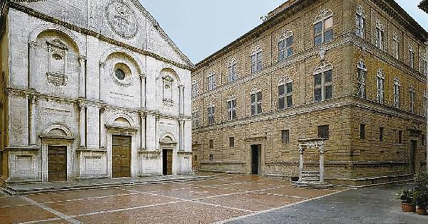 La seconda, invece, è a Pienza. Leggiamo cosa ha scritto: "In tema di piazze rinascimentali, impossibile non citare la Piazza centrale del Borgo di Pienza. Qui, sull’impianto medievale della cittadina, fu significativo l’intervento dell’architetto Bernardo Rossellino, su indicazione di Papa Pio II, che trasformò l’urbanistica del luogo secondo i canoni prospettici e le nuove geometrie rinascimentali. Camminando per Piazza Pio II ci si accorge di essere all’interno di uno spazio dove le forme e le proporzioni non sono casuali. Di forma trapezoidale con pavimentazione a spina di pesce, la piazza accoglie la presenza di costruzioni grandiose, prima fra tutti la Cattedrale dell’Assunta. Sulla piazza si affaccia anche Palazzo Borgia, oggi sede del Museo Diocesano, il Palazzo Comunale, con la sua bassa torre dell’orologio, ed il Palazzo degli Ammannati. Molto caratteristico è il Pozzo dei Cani, abbellito da due colonne che sorreggono l’effige in memoria di Papa Pio II".