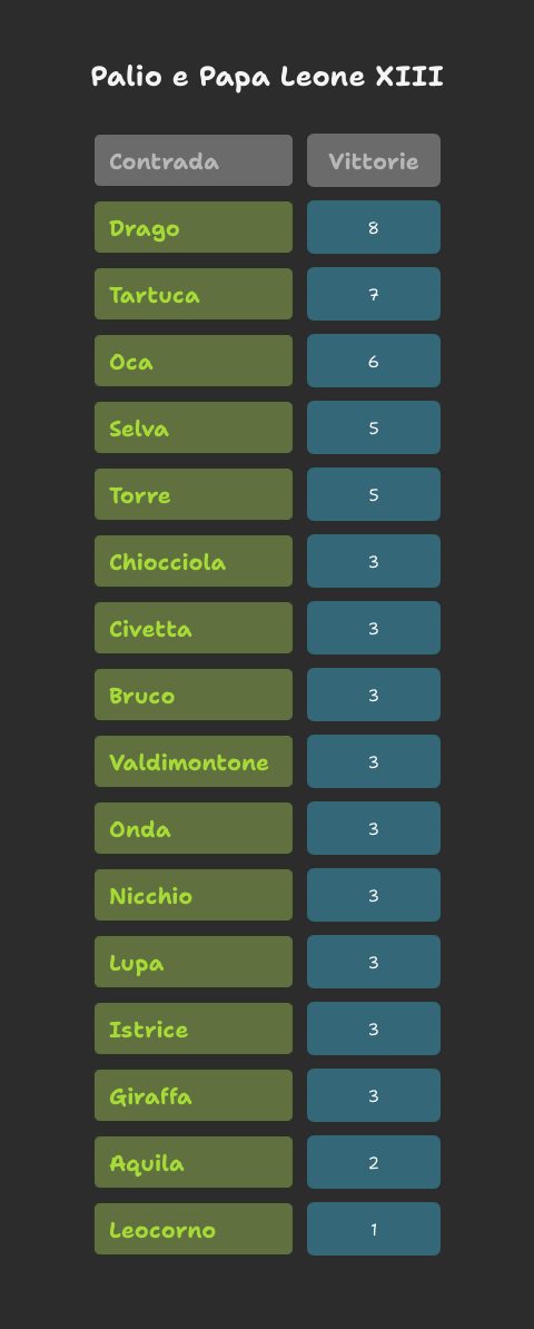 Tra le protagoniste assolute del periodo spicca proprio la Contrada di Camporegio, con ben otto successi. Non meno brillanti la Tartuca, con sette gioie, e l’Oca con sei. A seguire, Selva e Torre con cinque, Lupa, Civetta, Nicchio, Istrice, Giraffa, Chiocciola, Valdimontone, Bruco e Onda con tre, Aquila con due, e il Leocorno con un trionfo.