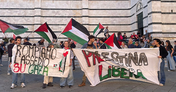 Continua la mobilitazione a Siena per dire basta all'offensiva nei confronti di Gaza, in Palestina. A fronte dell'attacco di Israele con i droni alle navi della Global Sumud Flotilla della scorsa notte, 400 persone si sono riunite questo pomeriggio davanti alla Prefettura di Siena a sostegno della missione umanitaria, appartenenti alle associazioni Cgil, Arci, Anpi, Rete senese contro il riarmo, Archivio Udi, Centro culturale delle donne Mara Meoni, Comitato Siena 2, Futura Siena, Non Una di Meno, Sunia, Oltremani, Forum per la pace Valdelsa, Auser, Rete SiSolidal e Spazio Livi. Bandiere, striscioni, forte la protesta contro quella che viene definita "l'ennesima violazione del diritto internazionale da parte del Governo di Israele".