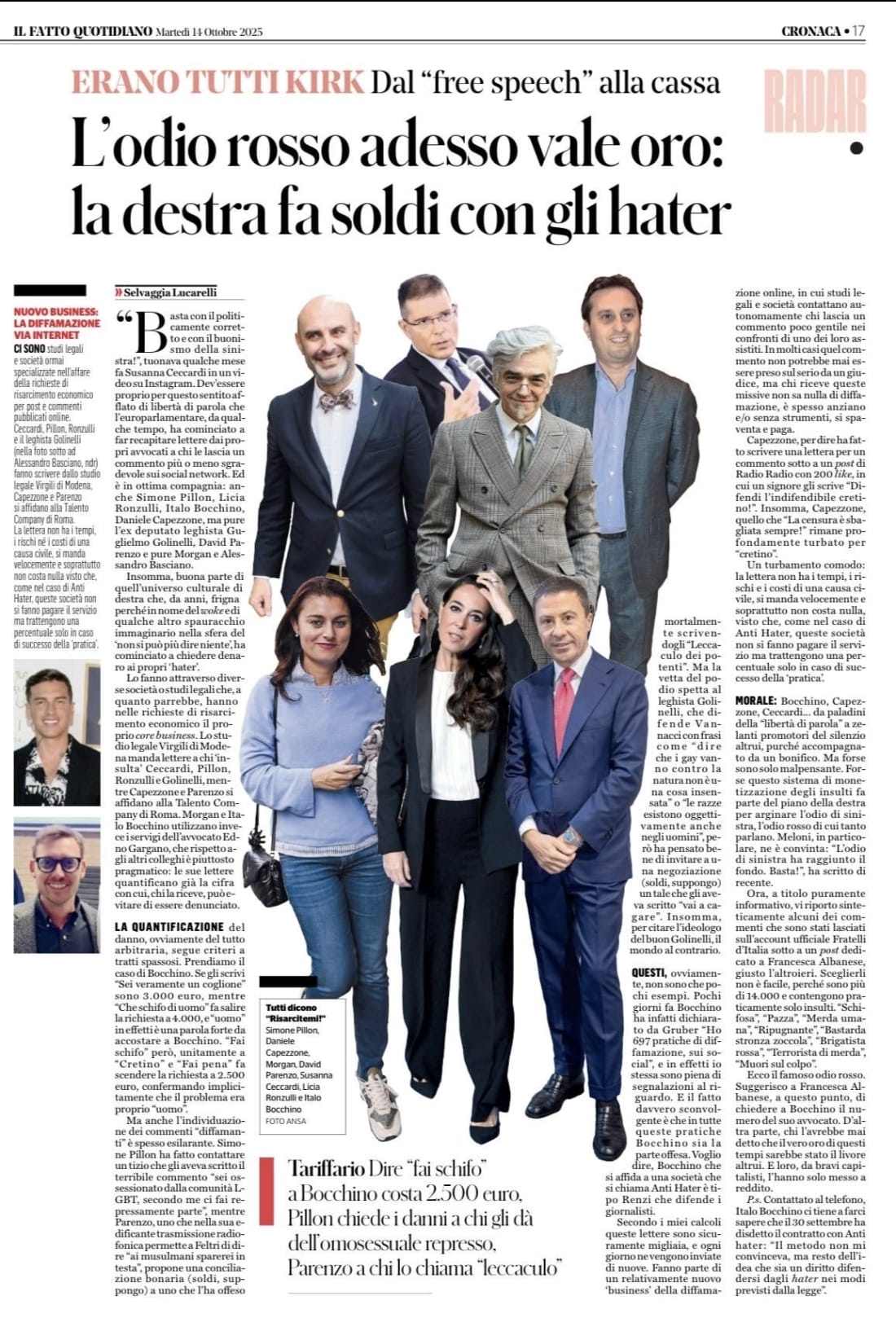 Tutti, secondo la Lucarelli, ricorrono a studi legali o società specializzate nel chiedere risarcimenti economici a chi si lascia andare a commenti sgraditi, trasformando così l’odio online in una forma di guadagno. Lo studio legale Virgili di Modena gestisce le pratiche per Ceccardi, Pillon, Ronzulli e Golinelli, mentre Capezzone e Parenzo si affidano alla Talento Company di Roma. Bocchino, che fino a poco fa utilizzava il servizio di AntiHater, ha recentemente disdetto il contratto pur riconoscendo il diritto a difendersi. Le lettere, a volte quantificando arbitrariamente il danno, indicano cifre di risarcimento a seconda dell’insulto, prima che sia un giudice terzo a stabilire l'effettivo insulto all'onore e il danno provocato.