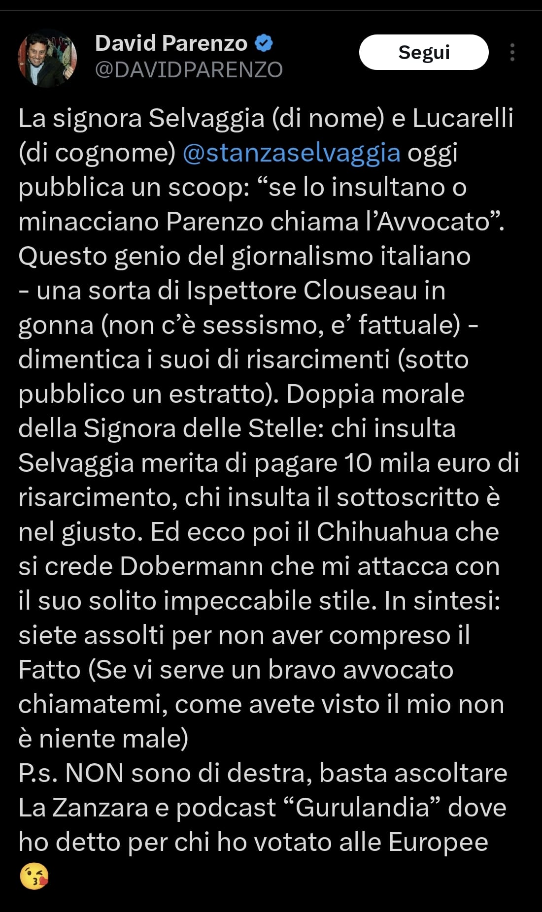 Quanto raccontato non è piaciuto a David Parenzo, il noto giornalista che secondo la Lucarelli utilizzerebbe questo metodo con chi lo attacca sui social. Sono volati autentici stracci tra i due a colpi di post su X: "La signora Selvaggia (di nome) e Lucarelli (di cognome) pubblica un scoop: “se lo insultano o minacciano Parenzo chiama l’Avvocato” - ha scritto - questo genio del giornalismo italiano - una sorta di Ispettore Clouseau in gonna (non c’è sessismo, e’ fattuale) - dimentica i suoi di risarcimenti. Doppia morale della Signora delle Stelle: chi insulta Selvaggia merita di pagare 10 mila euro di risarcimento, chi insulta il sottoscritto è nel giusto. Ed ecco poi il Chihuahua che si crede Dobermann che mi attacca con il suo solito impeccabile stile. In sintesi: siete assolti per non aver compreso il Fatto (Se vi serve un bravo avvocato chiamatemi, come avete visto il mio non è niente male)".