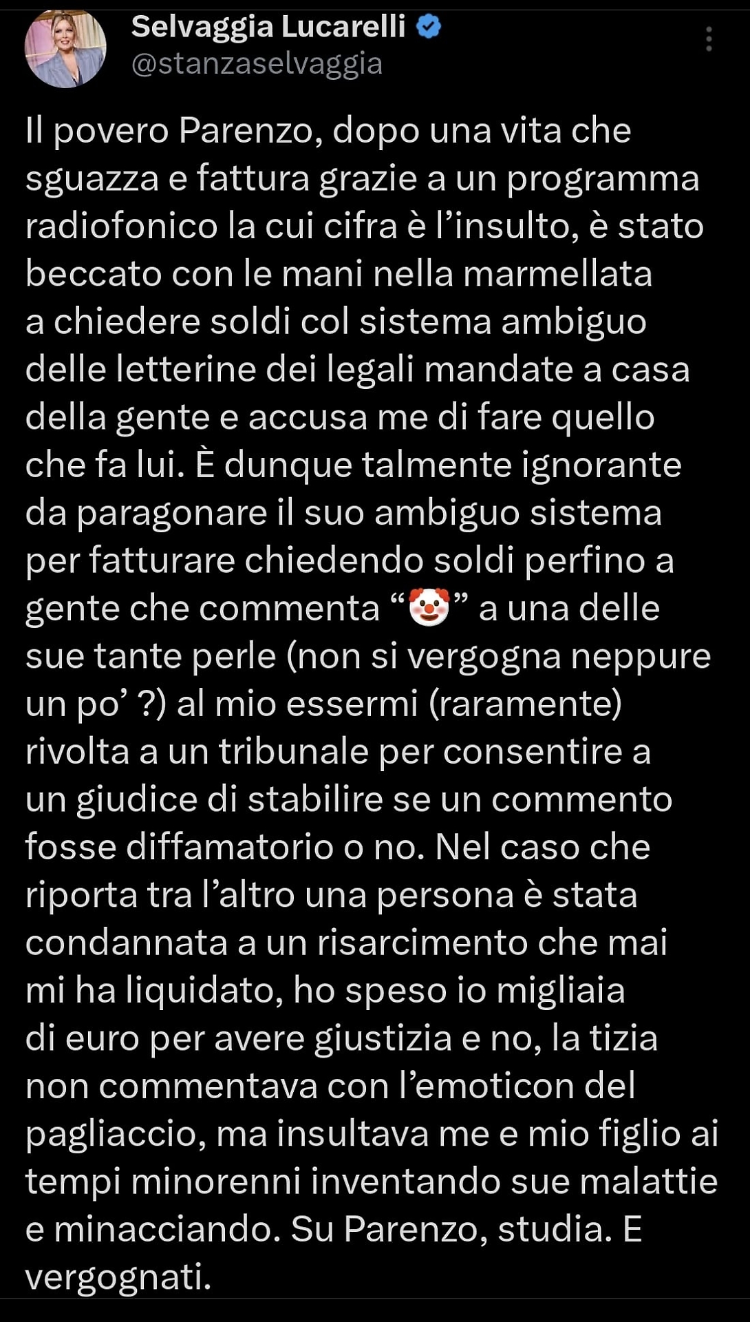 Pronta la replica della giornalista, sempre su X: "Il povero Parenzo, dopo una vita che sguazza e fattura grazie a un programma radiofonico la cui cifra è l’insulto, è stato beccato con le mani nella marmellata a chiedere soldi col sistema ambiguo delle letterine dei legali mandate a casa della gente e accusa me di fare quello che fa lui. È dunque talmente ignorante da paragonare il suo ambiguo sistema per fatturare chiedendo soldi perfino a gente che commenta a una delle sue tante perle (non si vergogna neppure un po’ ?) al mio essermi (raramente) rivolta a un tribunale per consentire a un giudice di stabilire se un commento fosse diffamatorio o no. Nel caso che riporta tra l’altro una persona è stata condannata a un risarcimento che mai mi ha liquidato, ho speso io migliaia di euro per avere giustizia e no, la tizia non commentava con l’emoticon del pagliaccio, ma insultava me e mio figlio ai tempi minorenni inventando sue malattie e minacciando. Su Parenzo, studia. E vergognati".