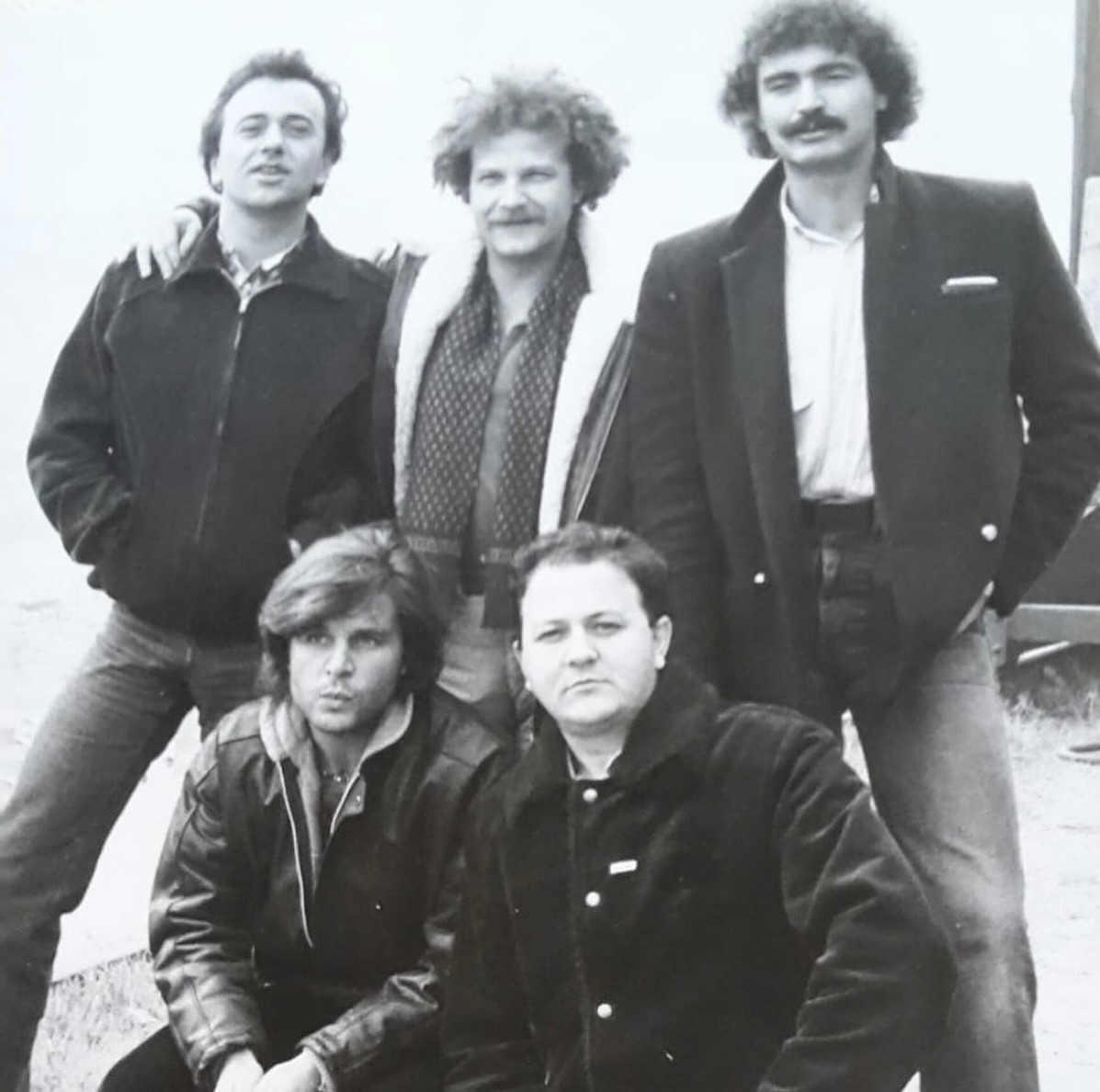 Mauro Di Francesco, il primo da sinistra in basso, con Boldi, Abatantuono, Faletti e Giorgio Porcaro