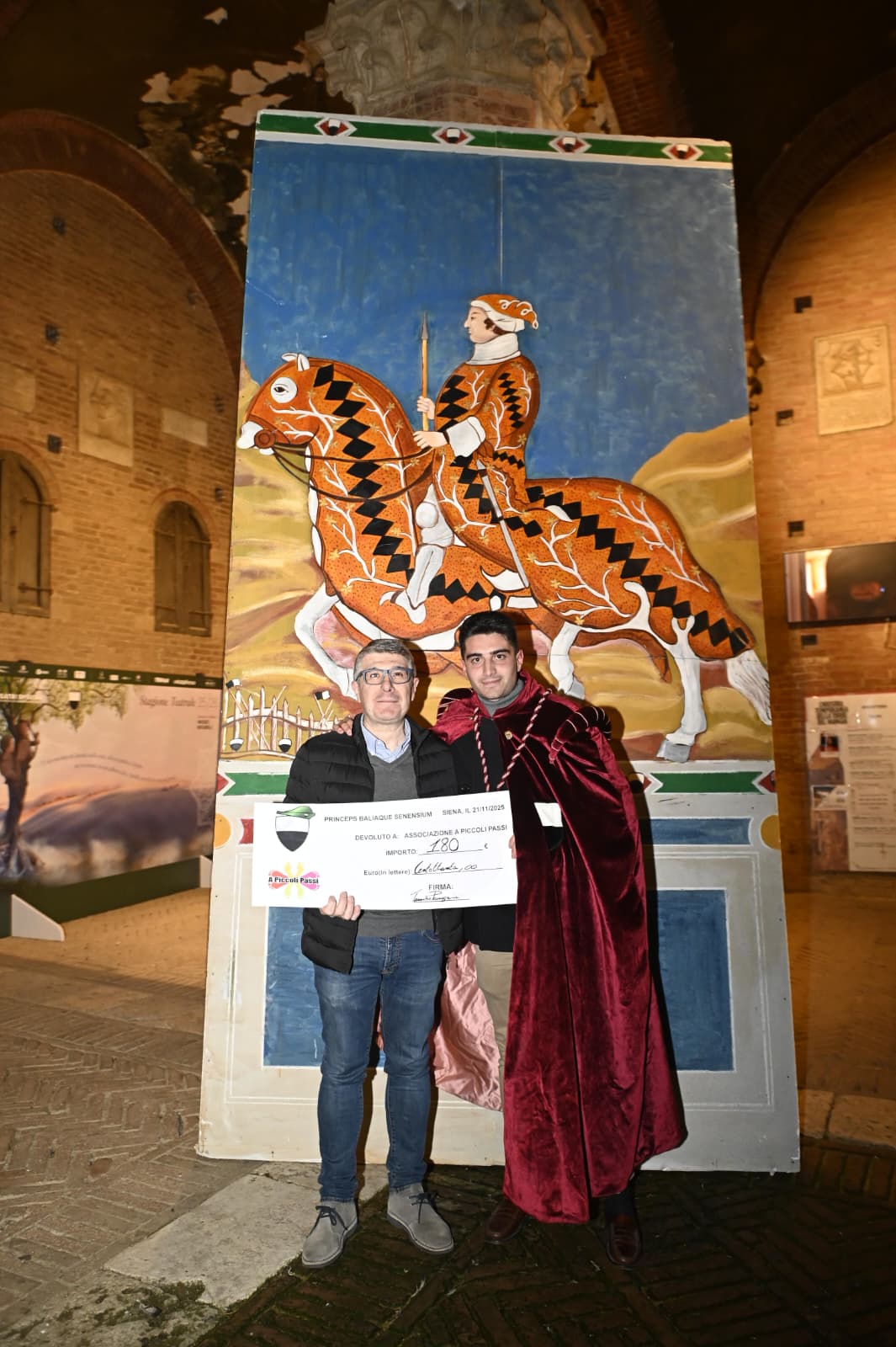 I goliardi senesi hanno festeggiato ieri l’ottantennale delle Feriae Matricularum con una grande giornata di festa che ha unito divertimento, orgoglio, memoria storica, malinconia e grande cuore. Gli studenti, guidati dal principe Tommaso Paccagnini, in primis hanno consegnato nel Cortile del Podestà, come annunciato nelle scorse settimane, l’incasso dell’asta di beneficenza del finto Guidoriccio da Fogliano rubato a Palazzo Pubblico all’associazione A Piccoli Passi di Siena. L’assegno da 180 euro è stato messo nelle mani del presidente Luca Ciani, che guida una preziosa realtà del territorio che aiuta soggetti colpiti da Alzheimer e loro famiglie nel percorso della malattia.