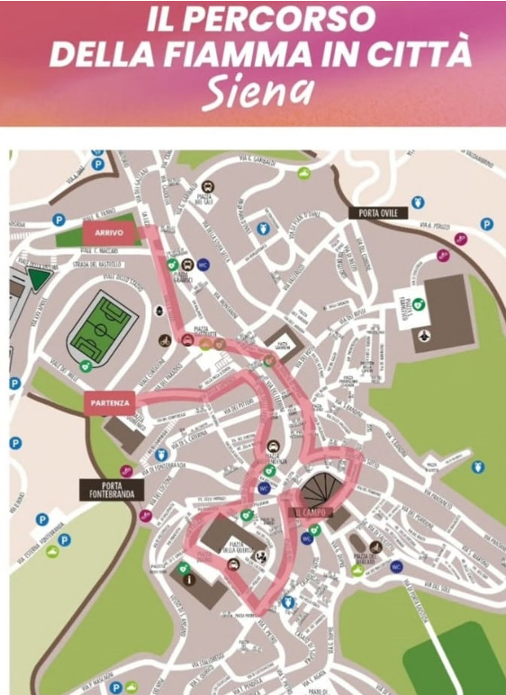 La fiamma olimpica partirà da San Domenico alle ore 19:00, per poi dirigersi in via della Sapienza, in via delle Terme e poi su verso il Duomo. Da lì la discesa verso via di Città e successivamente l’ingresso in piazza del Campo. Dalla conchiglia la fiamma uscirà per prendere la direzione di Banchi di Sotto, Banchi di Sopra, piazza Matteotti e infine l’arrivo alla Lizza, previsto per le 19:30. Ai Giardini della Lizza verrà acceso il braciere olimpico.