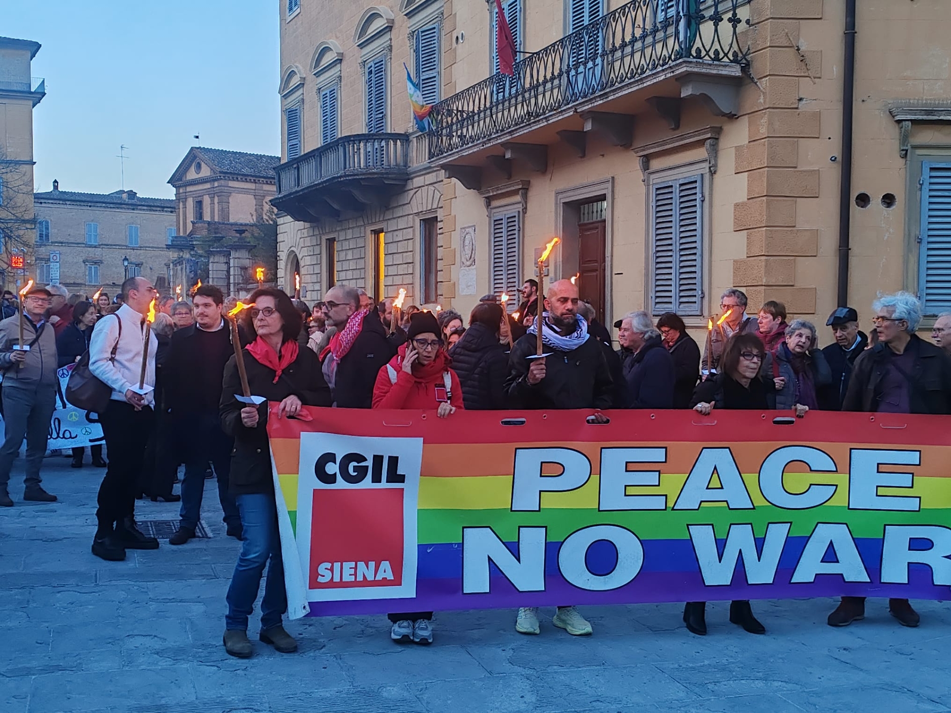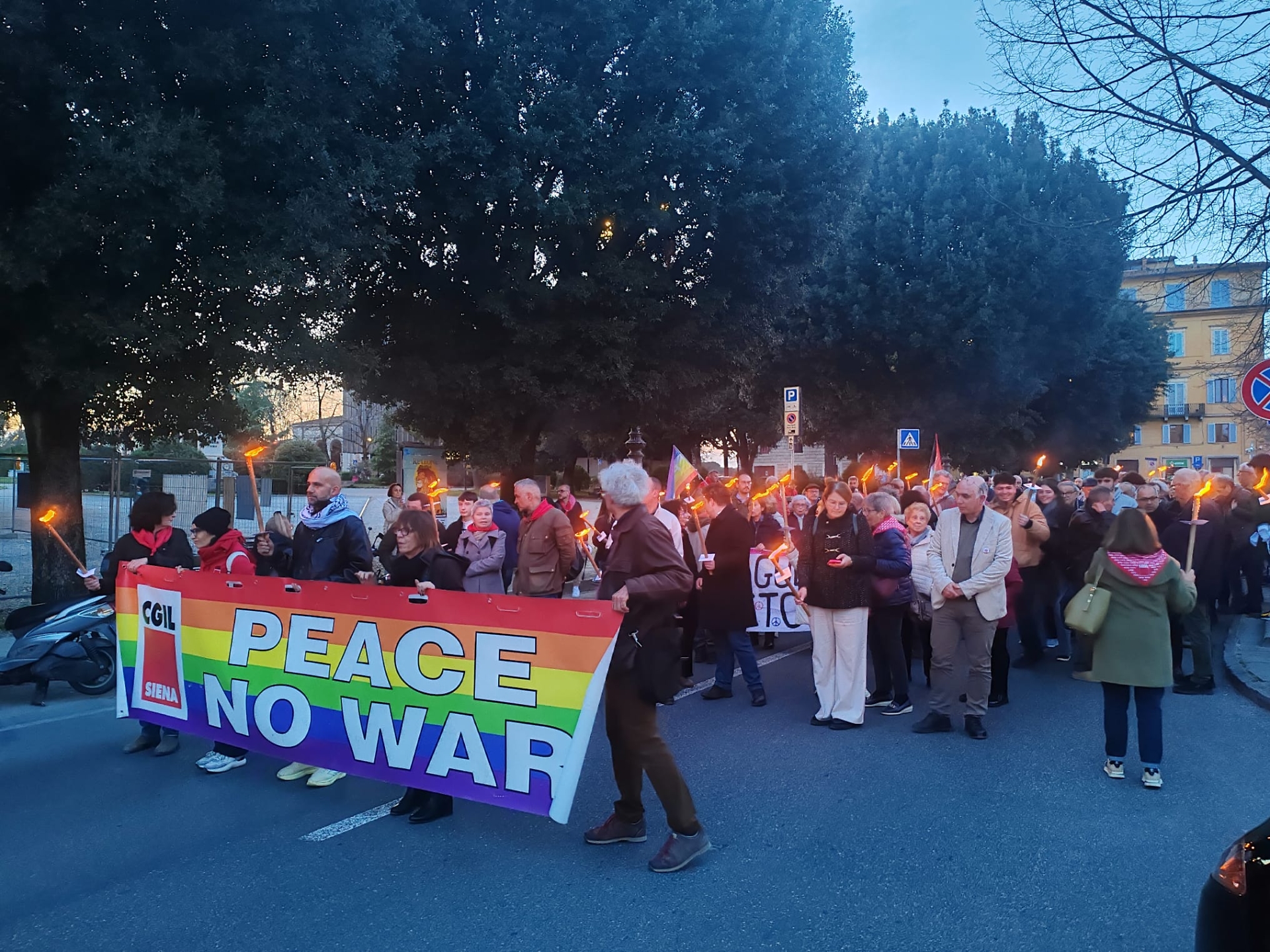 No a guerre e conflitti, sì a pace e rispetto del diritto internazionale. Siena è scesa in strada per dire basta alle tensioni e alle violenze che stanno infiammando il Medio Oriente con riflessi tangibili per l’economia e le famiglie. Circa 200 persone si sono ritrovate per dare vita a una fiaccolata – organizzata dal sindacato, Anpi, Arci e numerose altre associazioni e realtà locali – che ha raggiunto piazza del Campo per poi fare tappa in piazza Tolomei. Sostegno ai popoli oppressi dalle bombe, e chiari appelli ai “re del mondo” di interrompere le iniziative militari che stanno insanguinando sempre più su larga scala la terra. “I luoghi di guerra sono tanti, troppi, la situazione è grave – afferma il vice presidente Arci Siena Niccolò Trabalzini - assistiamo a una situazione di sistematica violazione del diritto internazionale, dobbiamo scendere in piazza con forza per mostrare al governo e alla società che esiste una parte di paese contraria a ogni forma di violenza”.