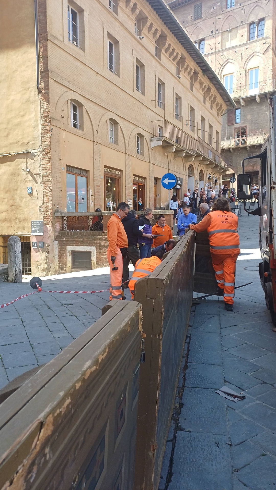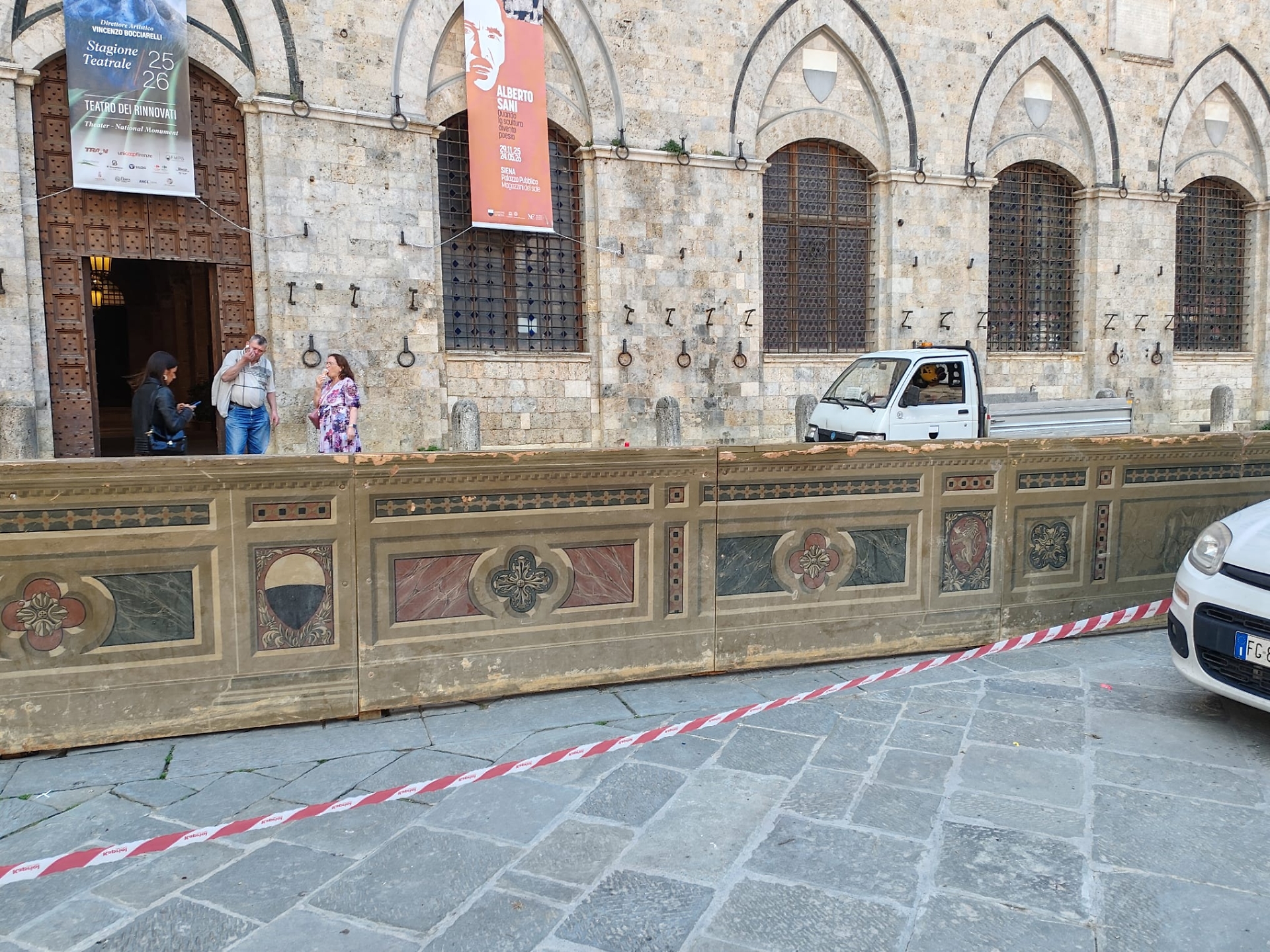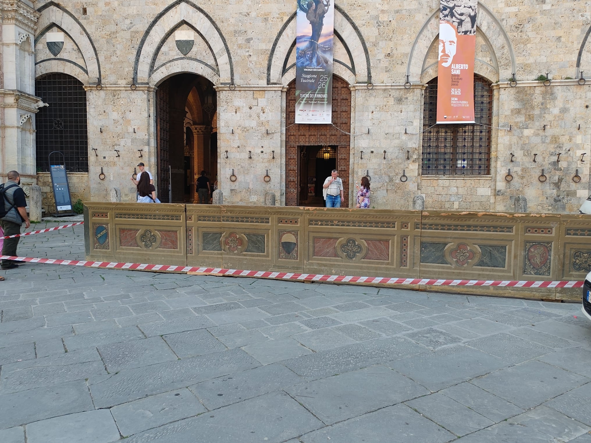 Questa mattina piazza del Campo è tornata ad animarsi con la presenza di steccati e degli allestimenti davanti al Palazzo Pubblico che hanno attirato l’attenzione di cittadini e turisti, creando per un attimo l’illusione di un anticipo di atmosfera paliesca. In realtà si è trattato di attività programmate, a seguito dei lavori svolti dall’acquedotto del Fiora che hanno interessato l’anello. Il tutto con lo scopo di favorire la progettazione e realizzazione dei nuovi parapetti, che verranno prodotti fedelmente sulla base delle misure di quelli attuali dopo il ripristino delle lastre.