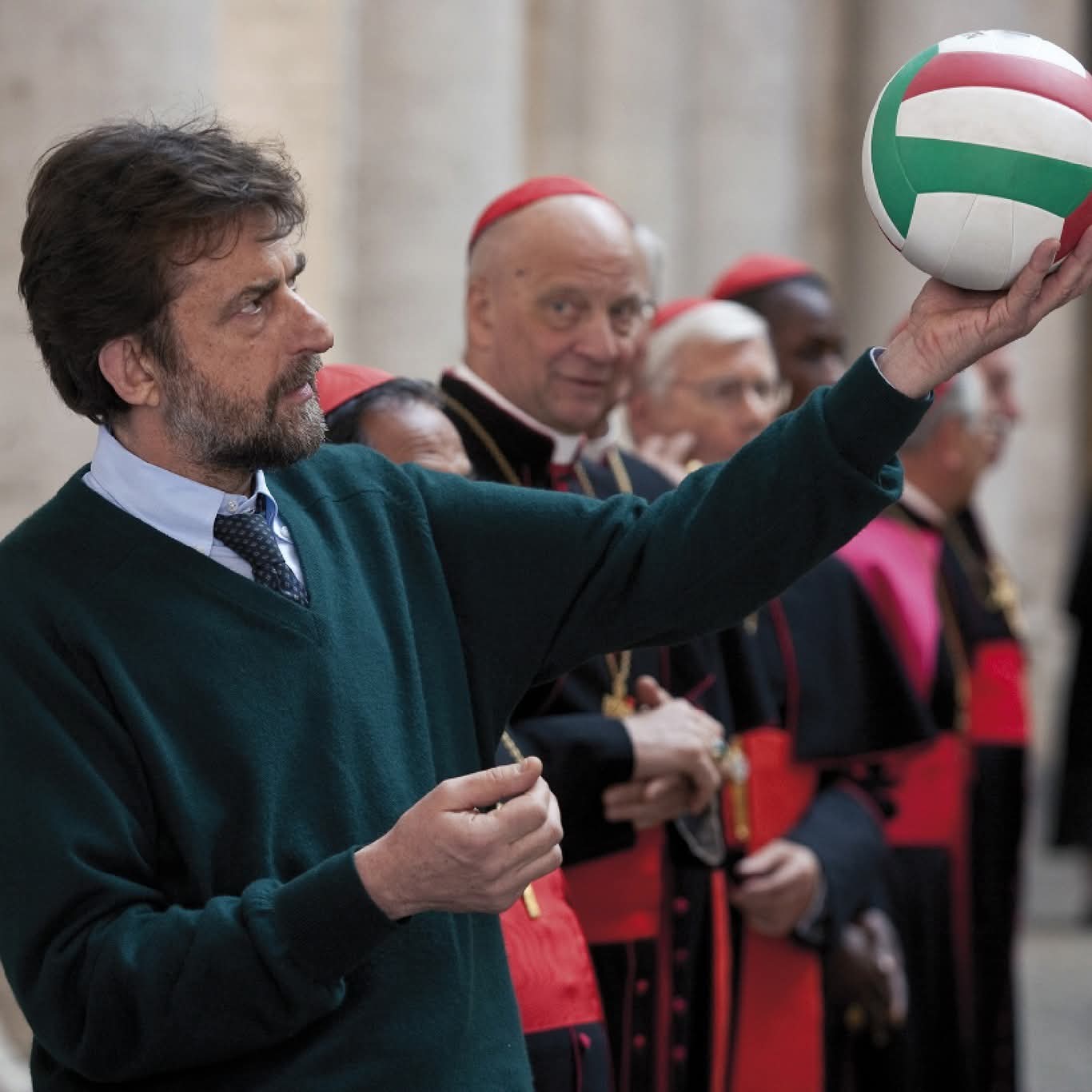 Moretti, nei panni dello psicoanalista Brezzi, intrattiene i Cardinali giocando a pallavolo