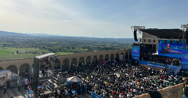Il saluto del ministro Locatelli e l'Inno di Mameli dal palco nella piazza della basilica inferiore di San Francesco di Assisi