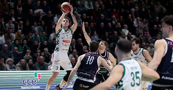 Grande pubblico, dove spicca l'ex capitano della grande Mens Sana Tomas Ress, nel derby senese che i biancoverdi vincono 76-73 in casa con la Virtus e mettono un altro mattone sulla strada dei play-in gold. Gli ospiti, in lotta per evitare i playout e garantirsi una salvezza senza patemi, vendono cara la pelle, difendono alla morte, chiudono in vantaggio i primi due quarti (19-21 e 40-41), ma nella terza frazione la maniglia passa alla Mens Sana, anche se la Stosa resta appiccicata almeno fino al 30'. Nell'ultimo quarto i ragazzi di Betti trovano la continuità in attacco inseguita fino a quel momento, quelli di Evangelisti, con un Joksimovic oberato di di falli ma presi per mano da Costantini e Gianoli, non allentano la pressione e ci provano con veemenza, ma quando l'ultimo arrivato Jokic assesta una magistrale stoppata proprio a Gianoli, il segnale è inequivocabile. La Virtus ha comunque il tiro finale per tentare l'aggancio e prolungare il derby ai supplementari, ma Guerra non ne fa di niente, non si avvicina neanche al ferro e il tabellone segna 76-73 per il boato degli oltre 2.000 del palasport di viale Sclavo.