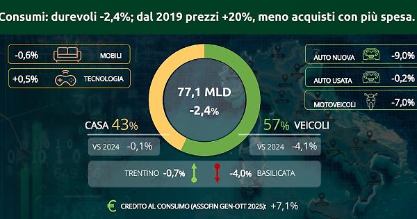 ROMA (ITALPRESS) - Dopo due anni di crescita il motore dei beni durevoli si ferma: a fine 2025 il comparto segnerà consumi in calo del 2,3% in volume e del 2,4% in valore, per una spesa complessiva che da 79 miliardi scivola a 77,1 miliardi. È la fotografia scattata dal 32° Osservatorio Findomestic, realizzato insieme a Prometeia, per un mercato che resta comunque su livelli più alti rispetto al pre-Covid, non per un aumento dei volumi acquistati ma esclusivamente per l'incremento dei prezzi che in 6 anni sfiora il 20%. A determinare il segno meno è soprattutto la mobilità, il segmento che da solo vale il 57% della spesa delle famiglie in beni durevoli. Qui la frenata è evidente, con le auto nuove in calo del 9% a valore. La casa - mobili e tecnologia - resta invece impantanata in una stagnazione che dura dal 2023, dopo gli exploit del triennio post-pandemico. Sul fronte territoriale, le tre locomotive storiche - Lombardia, Lazio e Veneto - perdono tra il 2,6 e il 2,8%. Resiste meglio l'Emilia-Romagna (-1,8%), che quasi aggancia il podio nella graduatoria per volumi di spesa. "Quest'anno i beni durevoli soffrono più degli altri comparti. Mentre servizi, alimentari e altri beni crescono - secondo i dati Istat - il nostro perimetro torna negativo dopo due anni di espansione, quella del 2023, trainata più dall'inflazione che dai volumi reali - afferma Claudio Bardazzi, responsabile dell'Osservatorio Findomestic -. Chiuderemo il 2025 con un -2,4% a valore, che si traduce in una reale riduzione della spesa delle famiglie'. Per Bardazzi 'siamo ancora su livelli di spesa superiori dell'11,4% al 2019, ma questo non significa che si compri di più. Il vero motore è stato l'aumento dei prezzi, vicino al +20%. Al netto dell'inflazione, cioè guardando ai volumi, i consumi di durevoli sono in realtà il 6,8% sotto i livelli pre-pandemia". In questo quadro di frenata il credito al consumo va in controtendenza, uno strumento che le famiglie stanno usando per reagire all'incertezza. Lo ribadisce Marco Tarantola, Amministratore Delegato e Direttore Generale di Findomestic Banca: "A fronte di consumi in calo nel mondo dei durevoli, il mercato del credito continua a crescere. Nei primi dieci mesi dell'anno le erogazioni segnano un +7%, con la rischiosità che rimane su livelli molto contenuti (1.7% il tasso di default a fine settembre 2025, pur mostrando un lieve incremento nel corso dell'anno. È la conferma che il credito al consumo svolge un ruolo sociale ed economico essenziale: aiuta le famiglie a non rinunciare ai propri progetti in un contesto che resta complesso". Il dato che più colpisce arriva dalle indagini condotte dall'istituto: "Oltre quattro italiani su dieci - ricorda Tarantola - hanno utilizzato una forma di credito almeno una volta negli ultimi tre anni. E più del 60% di chi lo ha fatto dichiara che, senza questa possibilità, avrebbe dovuto rinviare o rinunciare del tutto all'acquisto. Dati che confermano come il credito oggi sia una leva di fiducia, non solo un prodotto finanziario". Se l'Italia rallenta, ogni territorio lo fa con il suo stile. Ci sono regioni che assorbono meglio la scossa. In Trentino-Alto Adige, dove i redditi restano elevati e il clima economico è meno nervoso, il calo è solo -0,7%, il migliore d'Italia. Più sorprendente la tenuta della Sicilia e della Liguria, entrambe ferme a -1,3%: due territori lontani geograficamente ma accomunati da una domanda interna che resiste. All'opposto, in Basilicata il mercato dei durevoli cede il 4%: una flessione che non è solo statistica ma strutturale, fatta di consumi fragili e poca spinta demografica. Il rallentamento è stato consistente anche in Piemonte (-3,5%), Molise (-3,3%), Abruzzo e Lazio (entrambe -2,8%). Sul piano dei valori assoluti, la Lombardia continua a giocare un altro campionato: 15,4 miliardi, più del doppio del Lazio, che segue a 7,5. È la locomotiva che tira il Paese, anche quando il convoglio frena. Nel 2025 il mercato italiano della mobilità vive una doppia velocità: l'usato tiene la linea, il nuovo rallenta, le due ruote correggono la corsa dopo anni di sprint. Dal 2017 quello delle auto usate è il primo mercato per valore assoluto e continua a dimostrarlo. L'effetto inflazione è evidente: si spende il 25% in più rispetto al 2019 per acquistare appena il 3% di vetture in più. Nel 2025, dopo due anni di crescita, il settore rallenta e il suo giro d'affari chiuderà con un -0,2%, sostanzialmente in stallo, con l'incremento dei passaggi di proprietà (+2,1%) annullato dal calo dei prezzi (-2,1%). Ma i valori restano solidi: 24,4 miliardi di euro, quasi 8 miliardi in più dell'auto nuova, complice una domanda, negli ultimi anni, sempre più orientata al risparmio. Prezzi in calo e mix di vendita più 'popolare' confermano che il consumatore è cauto ma attivo. Per le auto nuove la frenata è netta: -9% a valore, con la spesa delle famiglie che scende a 16,5 miliardi. Le immatricolazioni calano (-9,9%), i prezzi restano stabili (+0,8%) dopo anni di forte crescita e il mix si sposta su fasce e tecnologie più costose. Le city car, un tempo spina dorsale del mercato, passano dal 17% del 2019 al 12%. La domanda dei privati resta lontana dai livelli pre-pandemia: -25% le immatricolazioni rispetto al 2019, -10% la spesa. Non bastano incentivi a singhiozzo per stimolare le famiglie, alle prese con un potere d'acquisto ridotto rispetto a qualche anno fa e con un contesto di persistente incertezza. Dopo quattro anni di crescita, arriva uno stop per le moto: -7,7% a volume nel 2025, -7,0% a valore. Ma il confronto con il 2019 resta impressionante: +36% a volume, +55% a valore, per un mercato che vale 2,75 miliardi e che ha beneficiato in questi anni di una domanda, che in un contesto di inflazione e calo del potere d'acquisto, ha visto nei mezzi a due ruote un'alternativa low cost alla seconda o terza auto in famiglia. La flessione del 2025 sottende dinamiche differenziate tra ciclomotori, in fo