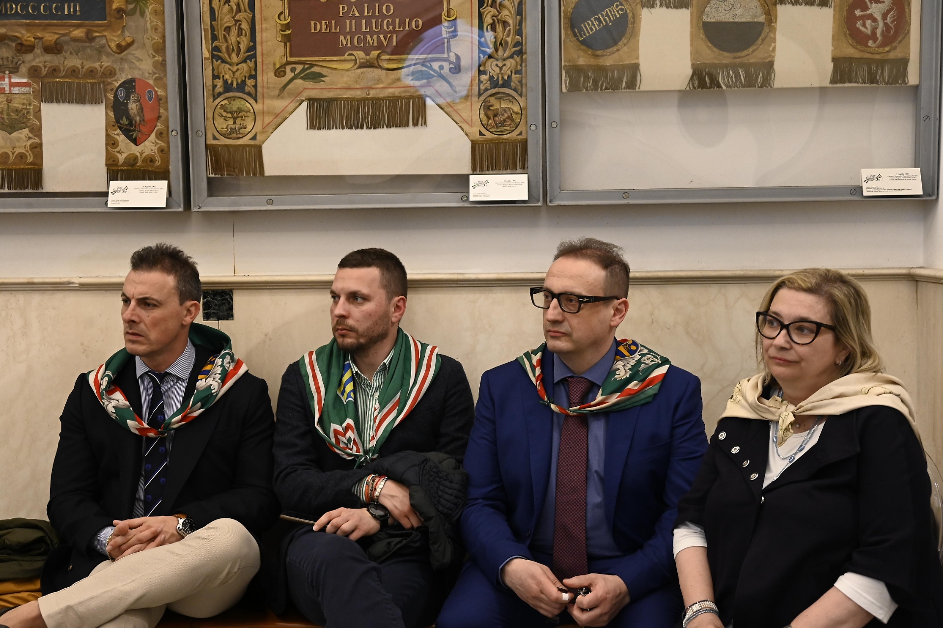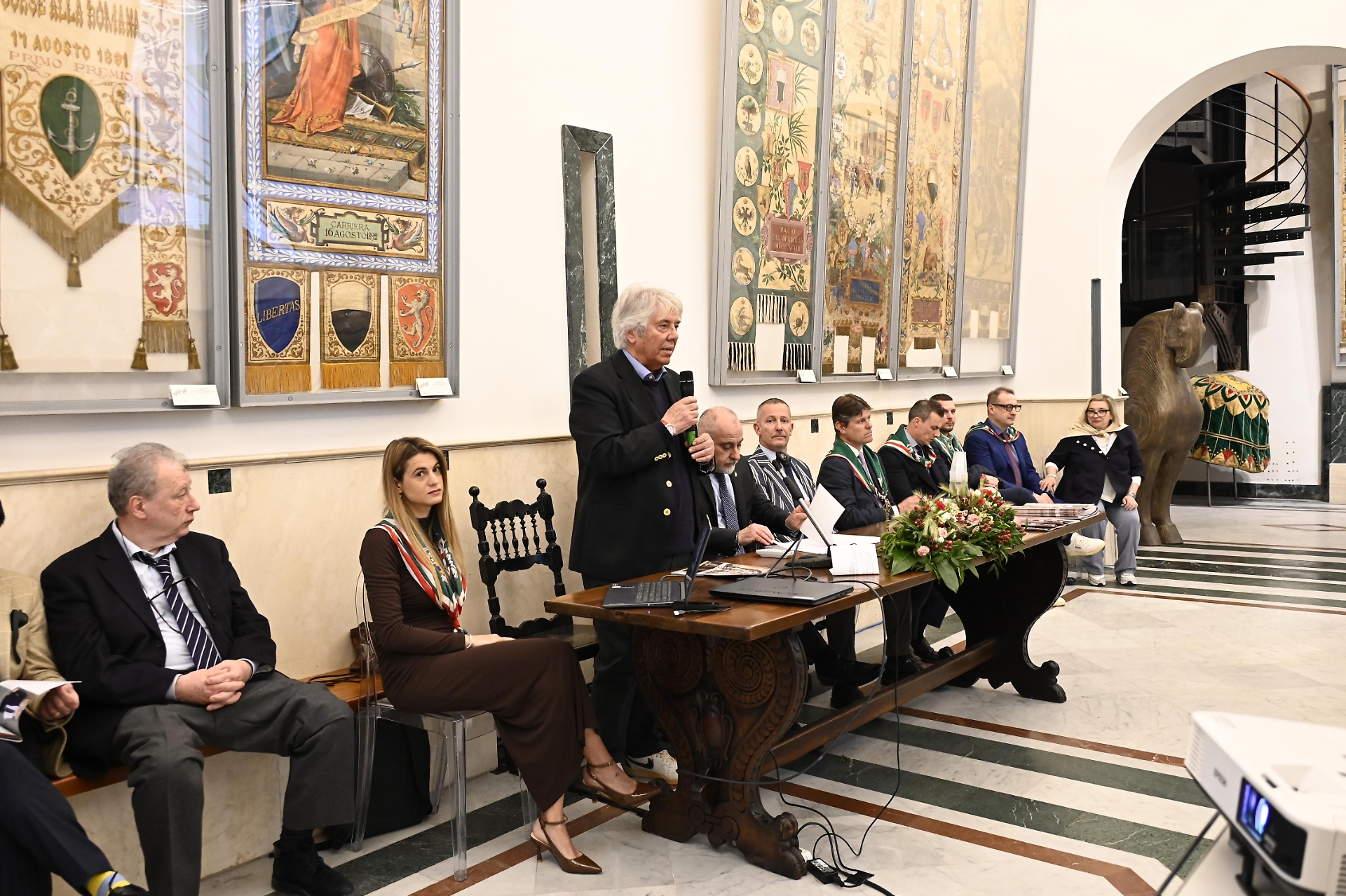 Afferma il governatore Laini: “Una è sulla pala dell’Arte della Lana, opera del Sassetta, presentata dal professor Gabriele Fattorini, che era nella chiesa di Sant’Antonio. L’altra è la Madonna dell’Arte della Lana, un tabernacolo in via delle Terme, realizzato da Giovanni Di Paolo, illustrato da Alessandro Leoncini. Siamo molto felici di questi due appuntamenti, che stanno a testimoniare il legame della contrada con queste opere. Siamo molto soddisfatti anche della mostra dal titolo Bozzetti sull’evoluzione delle bandiere e degli stemmi della Nobile Contrada dell’Oca: l’esposizione è realizzata grazie a materiale fornito da Alberto Botarelli, con questo appuntamento ricordiamo un grande ocaiolo come Bettino Marchetti autore di tanti disegni e bozzetti. Proviamo inoltre soddisfazione per la realizzazione di otto nuove bandiere, e devo dire che sono nate dopo una lavorazione incredibile da parte di pittori e bandieraie. L’orgoglio e la soddisfazione sono aumentati dal fatto che tutte queste lavorazioni sono state realizzate da ocaioli”.