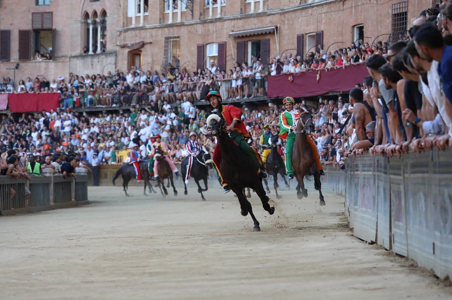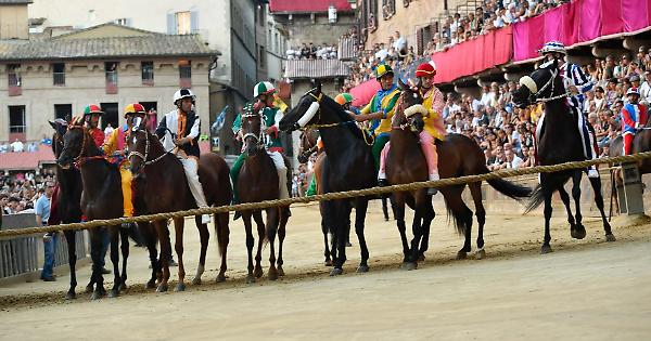 Carboni non si scompone, ma le difficoltà di Tale e Quale proseguono anche dentro i canapi, con Carburo che fatica un po’ a tenere allineato il barbero. E, appunto, è strano pensare che simili problemi possano capitare a un soggetto che ha già corso due Palii, anche se l’ultima sua Carriera disputata (e vinta) è di ben sei anni fa. Questo pomeriggio, nella prima prova, quelli che sono ritenuti i due big tra i dieci cavalli del lotto non hanno brillato: già scritto delle difficoltà incontrate da Tale e Quale, non ha brillato neppure Zio Frac, che la dea bendata ha mandato nella Tartuca e che è montato da Carlo Sanna. Le due contrade rivali erano vicine al canape, così come è avvenuto anche alle altre due contrade rivali di questo Palio, cioè Istrice e Lupa. Ma non si è registrato alcun tipo di problema, con i fantini che hanno cercato soprattutto di prendere al meglio il tempo della mossa e di far fare una buona sgambata al cavallo.
