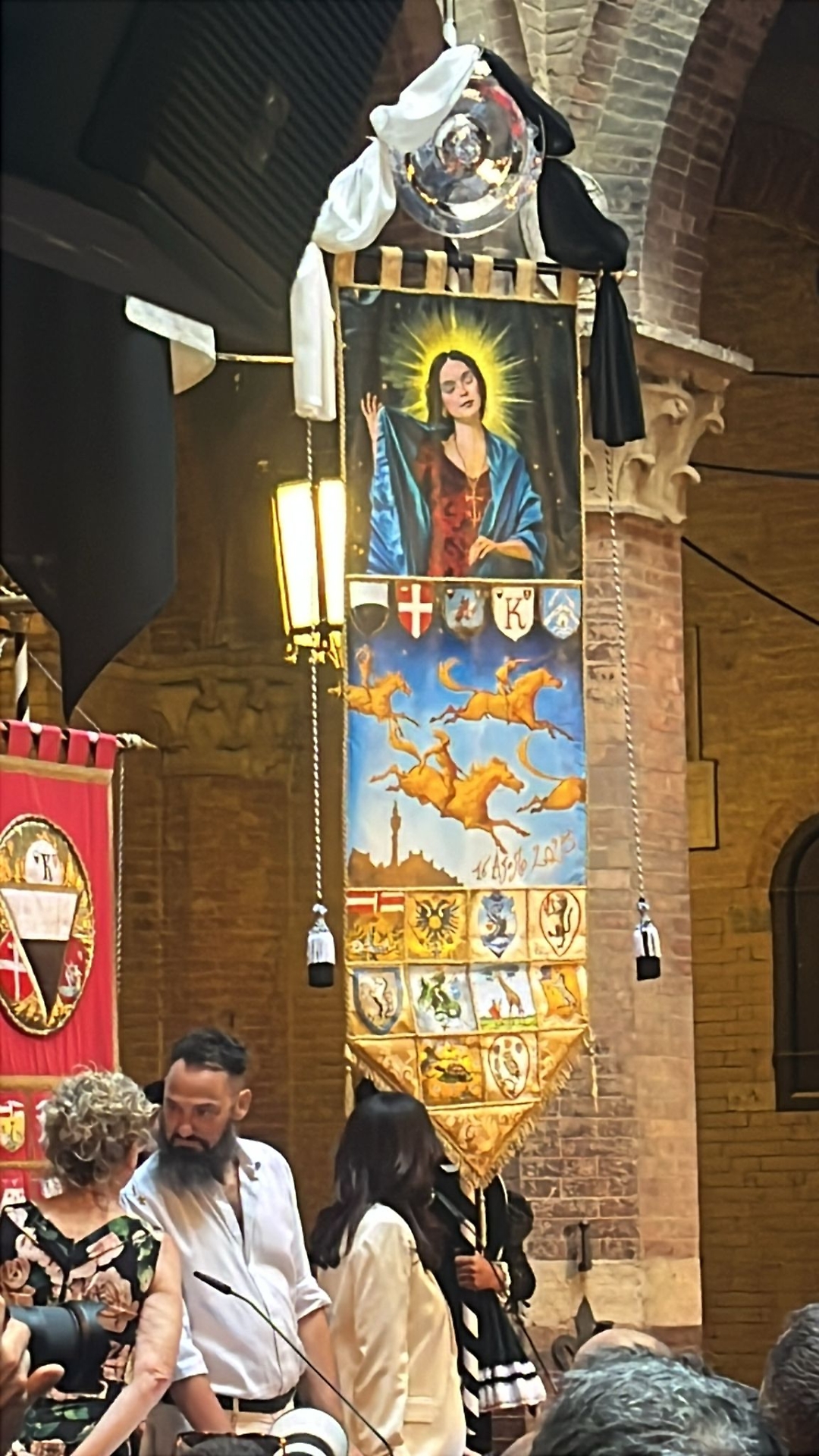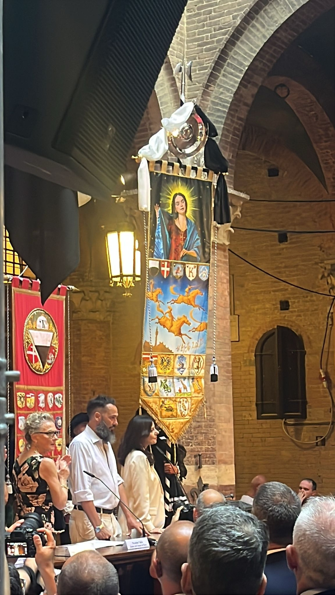 “Un artista – ha commentato Nicoletta Fabio, Sindaco di Siena – da me fortemente voluto e stimato. Al centro di tutto, la forza evocativa di due immagini che si incontrano e si completano. La figura della Madonna Assunta in cielo, iconica, sembra arrivare leggiadra e solenne a un appuntamento importante, che sapeva di avere, e per il quale ha voluto indossare la sua veste più bella e preziosa: è il giorno dell’Assunzione. Una Vergine moderna, giovane e raffinata nei suoi abiti e nei suoi accessori. Le sfumature di un blu intenso, quello della sua veste, si riversano in un’alba cittadina, con uno skyline di Siena dorata sullo sfondo. Dorata come i cavalieri che compongono la seconda immagine e parte del Drappellone, in corsa, sopra gli stemmi delle 10 Contrade. Cavalieri dorati, come lo sono le cuciture del cencio realizzate dalle nostre sarte e non dipinte, protagonisti di una corsa mitologica, pagana. Forte e potente il parallelismo creato da De Grandi tra la nostra corsa e il culto dionisiaco. L’esperienza religiosa del culto dionisiaco portava i fedeli a perdersi completamente per entrare in una dimensione che trascendeva la ragione. Un po’ come sono raffigurati questi cavalieri dorati, tra cielo e terra, che gareggiano a nerbo alzato verso la vittoria. Una dimensione che noi senesi conosciamo bene, che si manifesta durante la Carriera ma non solo, in maniera sfrenata, travolgente, a tratti anche folle. Pensando a quei momenti mi è tornata alla mente la descrizione fatta da Nietzsche proprio su Dioniso ‘Ma questa volta vengo come Dioniso il vittorioso che farà della Terra una giornata di festa’. Una festa che dunque ci fa perdere e ritrovare in noi stessi, che ci travolge, ci trasforma e ci costringe ad una corsa sfrenata, senza tempo. Una forza sovrannaturale che entra nelle nostre vene e che ci esalta, ci inebria. Questo racconta per me il cencio di Francesco De Grandi. Una follia consapevole che spero ci guidi sempre nel vivo delle nostre tradizioni”.