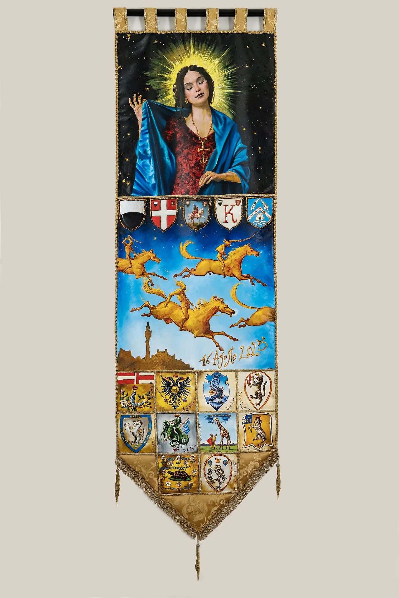 La composizione è organizzata in modo regolare, secondo una scansione per finestre, rinunciando all'unità narrativa ed evocando i polittici costruiti per pannelli, le predelle delle pale d'altare, i dittici e i trittici su tavola. La scelta di raccordare le varie parti con una preziosa passamaneria dorata, e poi di chiudere l’estremità inferiore con un tessuto damascato, anch’esso color oro, è una dichiarazione di aderenza alla tradizione, pensando all’antica arte tessile e alla sua straordinaria applicazione in ambito civile e religioso. Allo stesso modo simboli e animali che identificano le Contrade sono riproposti fedelmente all’interno degli stemmi, perfettamente riprodotti: l’artista ha giusto aggiunto i nomi, scritti di suo pugno. In alto domina la scena la figura di Maria, la cui resa realistica chiama in causa l’iconografia sacra e la figurazione classica, al contempo modificandola, proiettandola altrove, in un processo raffinato di attualizzazione e insieme di proiezione onirica. Lo scialle di Maria diventa un lembo di cielo ricamato di stelle, che lei dischiude appena, generando una pioggia siderale. Ed è proprio da quel manto che sembra provenire lo sciame volante di cavalli e cavalieri, in picchiata verso il suolo di Siena, che appare sullo sfondo, a sinistra, un miraggio dorato in lontananza.