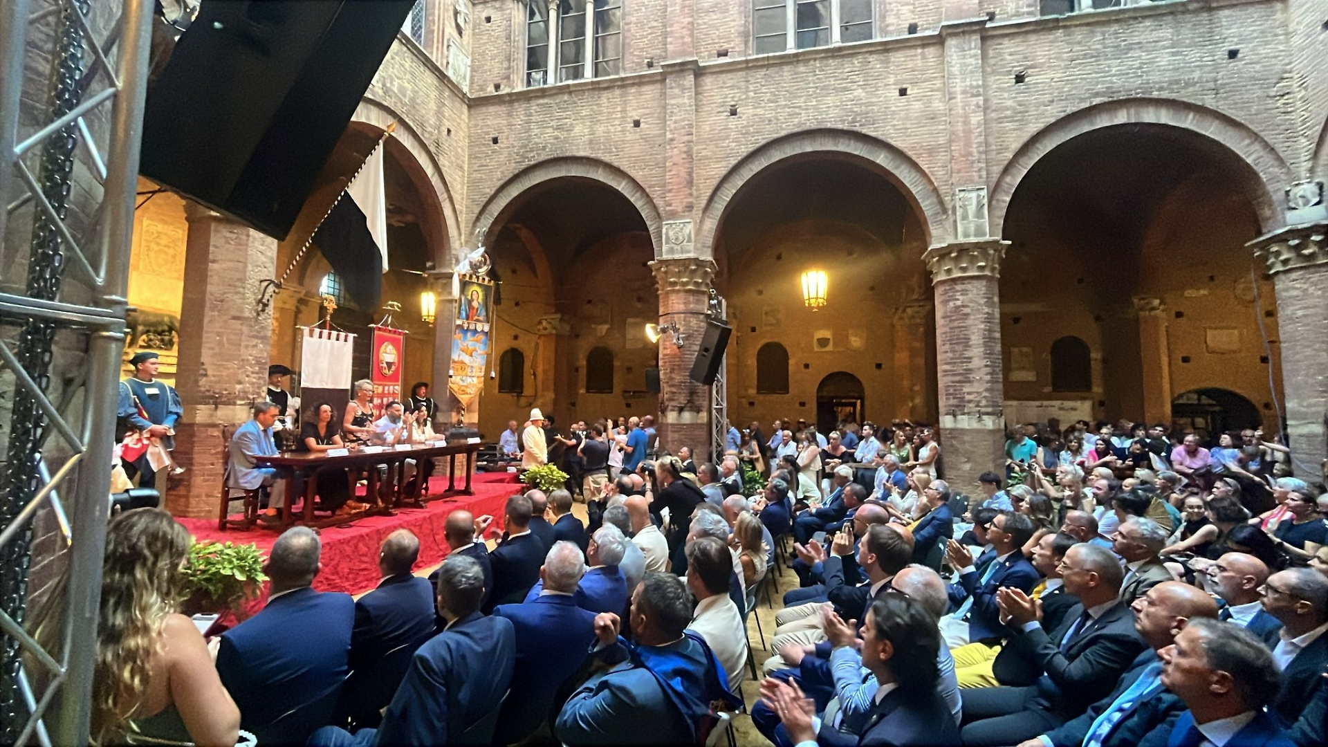 Applausi a scena aperta per il drappellone realizzato dal pittore siciliano Francesco De Grandi per il Palio dell'Assunta 2025. L'opera è stata svelata pochi minuti fa in un gremito cortile del Podestà, a presentarlo è la critica d’arte Helga Marsala. Un drappellone "maestoso e raffinato" lo ha definito il sindaco Nicoletta Fabio.