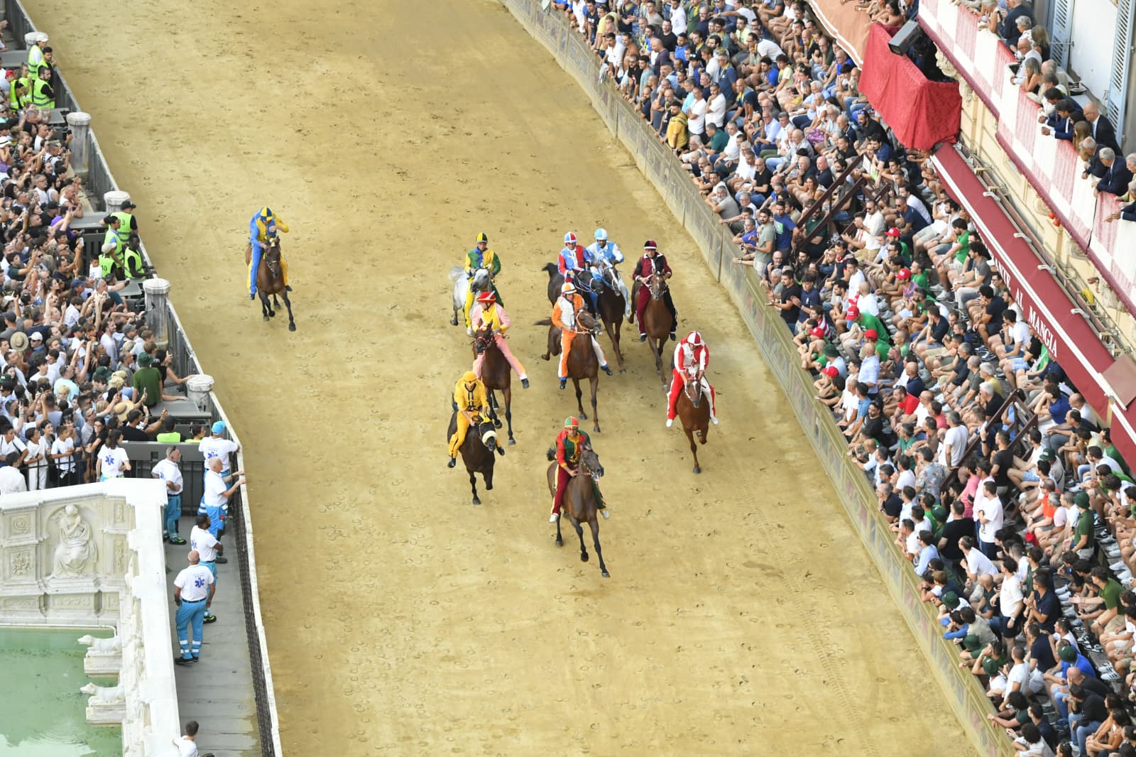 Partono bene il Drago, con Andrea Coghe su Zenis, e il Leocorno con Giovanni Atzeni su Diodoro. Passa però davanti l’Aquila che con un buono spunto prende il comando: seguono Giraffa, Tartuca e Drago.