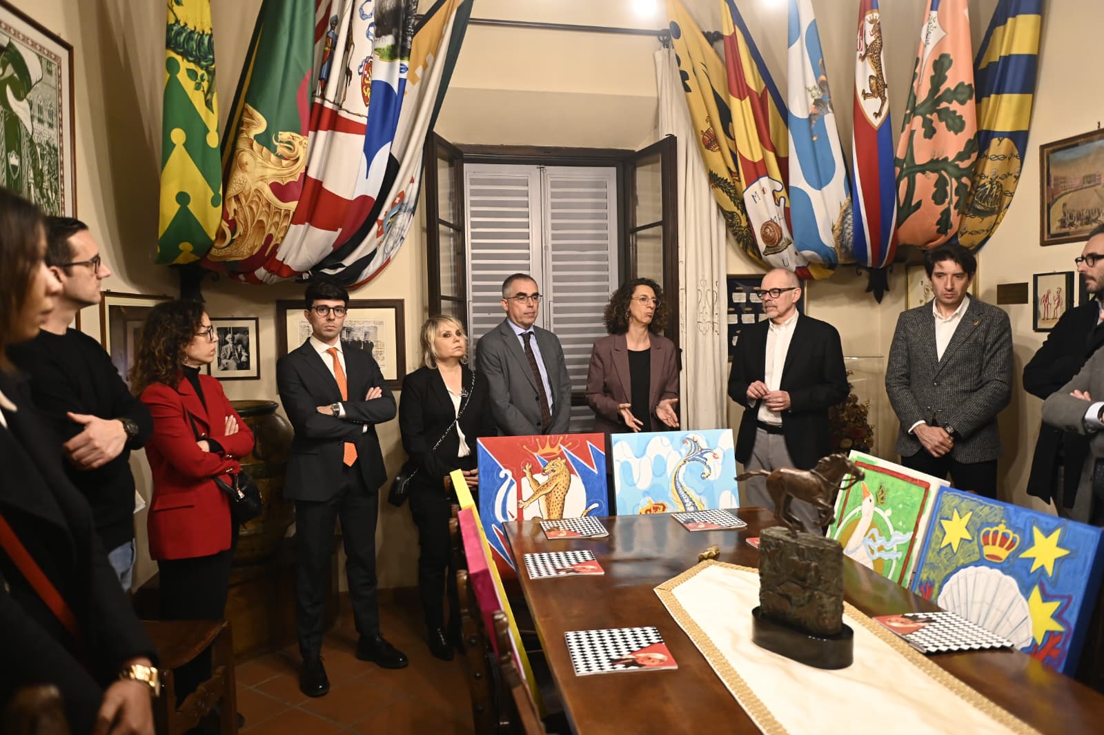 Le bellissime opere realizzate dall’artista Lidia Bachis, che ha rivisitato in chiave contemporanea gli stemmi delle 17 Contrade di Siena, tornano “a casa”. Le tele, esposte nel corso della mostra “La mossa del cavallo” (tenutasi da giugno ad agosto a Palazzo Saracini) curata da Giuseppe Simone Modeo e resa possibile da ChiantiMutua ETS, ChiantiBanca e Bramo Srls, sono state consegnate ieri pomeriggio in una gremita stanza del Magistrato delle Contrade, alla presenza di rispettivi Priori. Un momento sentito e inedito per il luogo, per valorizzare la scelta di far continuare a vivere le opere nei musei delle consorelle e far proseguire il messaggio identitario dell’evento culturale e artistico. E non finisce qui perché l’idea è quella di poter riunire nuovamente, quando ci sarà l’occasione, le tele in un nuovo evento espositivo.