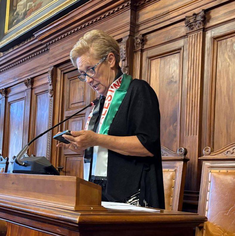 Seduta straordinaria questa mattina per il consiglio comunale di Siena. Oltre al tema del raddoppio della Cassia e ad alcune interrogazioni, la novità della giornata è arrivata dal gruppo consiliare del Partito Democratico. I consiglieri di minoranza Anna Ferretti (capogruppo), Luca Micheli, Alessandro Masi, Giulia Mazzarelli e Gabriella Piccinni hanno esposto la bandiera della Palestina per criticare l’amministrazione comunale, come segno di solidarietà e per protestare contro le azioni militari e le politiche israeliane nei territori occupati. Anna Ferretti è anche intervenuta indossando al collo il vessillo palestinese.