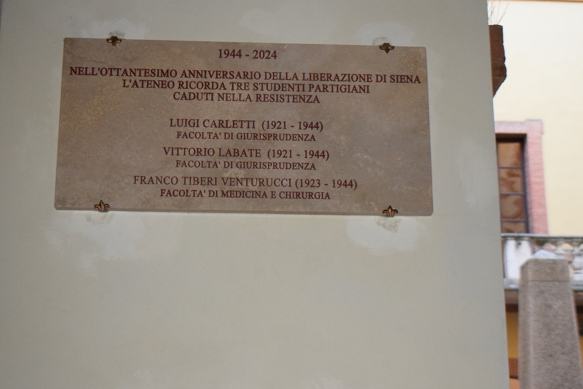 L’Università di Siena ha ricordato, con una lapide apposta nel cortile del palazzo del rettorato di Siena, tre suoi studenti partigiani fucilati dai nazisti nel 1944.