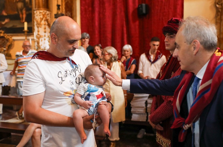 Il priore della contrada della Torre, Massimo Bianchi, parla di forti emozioni, provate ieri con il rito del battesimo contradaiolo, e già in precedenza con l’iniziazione dei diciottenni, e che certamente verranno vissute anche oggi con il momento clou della Festa titolare, il giro. Tanti sorrisi ieri in Salicotto per l’ingresso di molti bambini e giovani nella famiglia torraiola. “Sono onorato di vivere questo momento con il ruolo di priore - commenta Massimo Bianchi. - Ricordo che da ragazzo guardavo spesso la fotografia, ormai molto datata, che fu scattata in occasione del mio battesimo contradaiolo, quando io sono entrato in questa famiglia. Sono momenti molto emozionanti ed importanti, nei quali si vive una sorta di passaggio di consegne e di testimone. La stessa cosa avviene con l’iniziazione dei diciottenni: in occasione di quella cerimonia ho parlato con i giovani relativamente a quella che è una responsabilità che loro hanno per il futuro, vale a dire la necessità di preservare gli ambienti, la tradizione e il rispetto”.