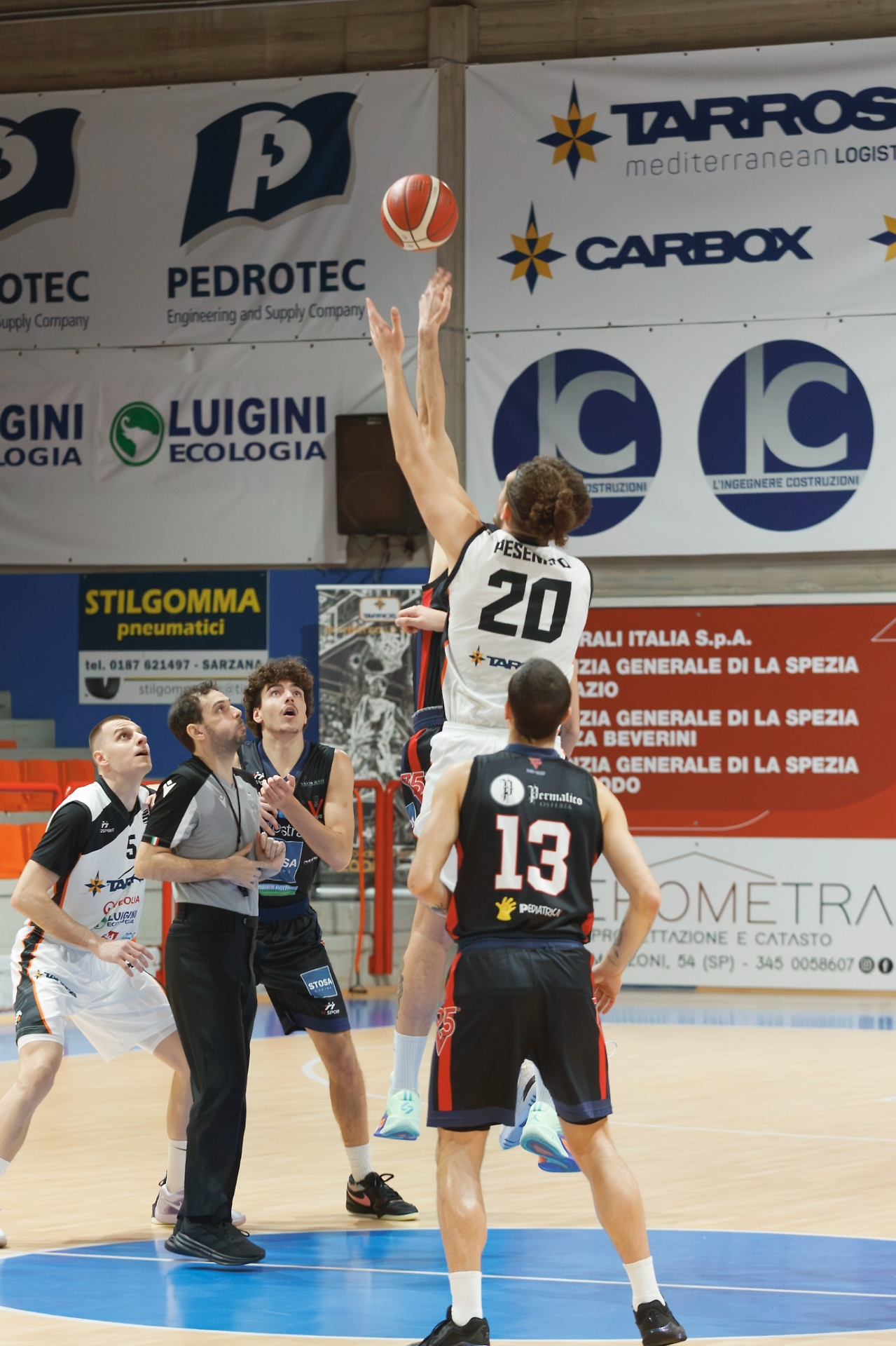 Avvio contratto per la Stosa, mentre Spezia scalda subito la mano da fuori, costruendo un parziale importante e scappando nel punteggio sul 16-2. A sbloccare la Stosa, dopo diversi minuti senza segnare, è una tripla di Guerra. I rossoblu che iniziano a mettere più aggressività in difesa alternando anche soluzioni diverse, ma l'inerzia della partita non cambia, e il primo quarto si conclude 23-8.