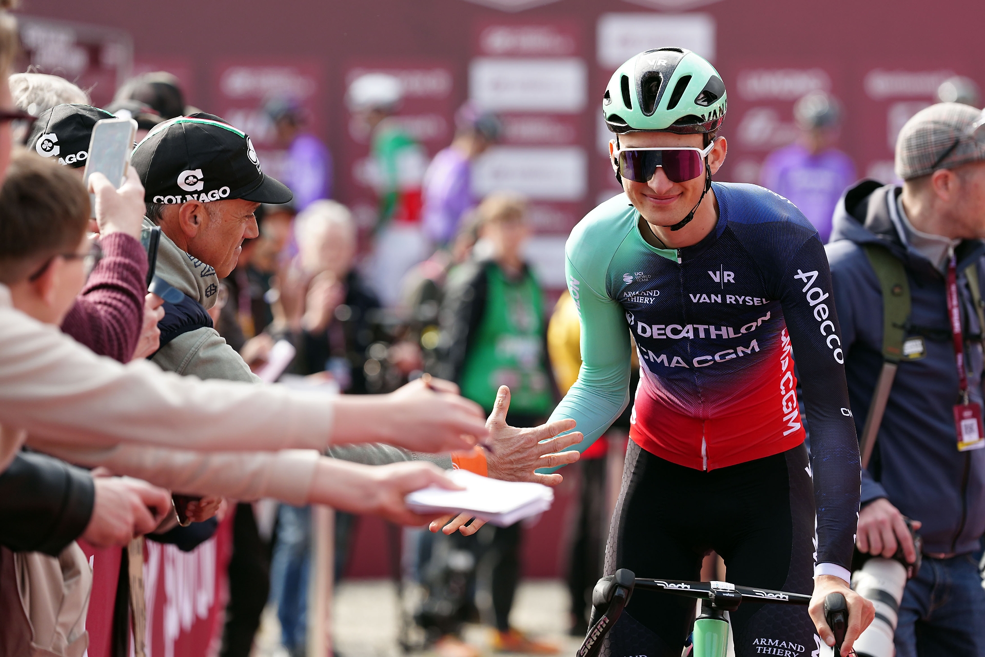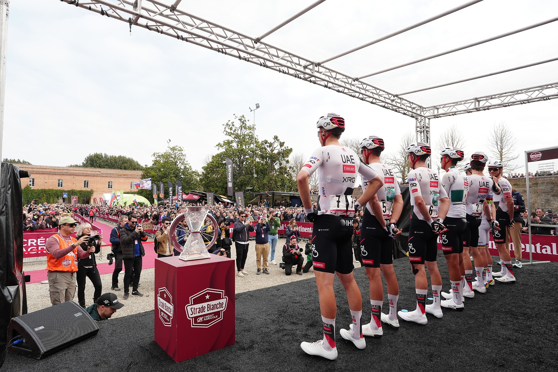 La lista degli outsider include Ben Healy, Valentin Madouas, Paul Seixas e Tibor Del Grosso. Curiosità inoltre per Isaac Del Toro, già a segno all'UAE Tour. Tra gli italiani i nomi da seguire saranno quelli di Filippo Zana e di Giulio Pellizzari, che correrà la Strade Bianche Crédit Agricole per la prima volta. Il gruppo, forte di 175 atleti, è transitato al km 0 alle 11.55.