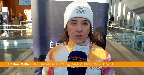 Fiamma Olimpica in sede torinese di Intesa Sanpaolo, Motta e Cascella tedofori