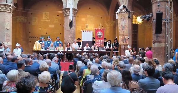 Ha ricevuto molti applausi dai contradaioli presenti nel Cortile del Podestà il drappellone per il Palio di luglio realizzato dall’artista senese Riccardo Manganelli. Il Cencio è piaciuto, e il sindaco di Siena Nicoletta Fabio lo ha definito “un drappellone alla senese, nella forma e nei colori”. Ai contradaioli sono piaciuti i colori, la composizione e quelle mani che accolgono e si mostrano pronte ad abbracciare il cavallo presente nella raffigurazione. “E’ un dipinto che tocca il cuore ed emoziona”, ha affermato Giovanni Mazzini, che ha illustrato l’opera. E ancora Mazzini: “Questo drappellone testimonia la passione viscerale dell’artista per la città e per il Palio”.