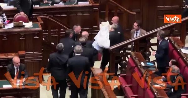 Magi in Aula vestito da fantasma protesta contro invito ad astensione al referendum, espulso di peso