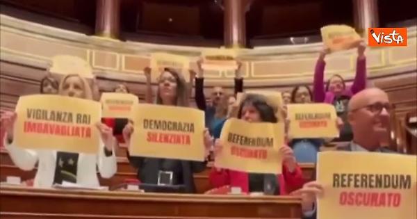 "Democrazia silenziata, referendum oscurato, vigilanza Rai imbavagliata", i cartelli del M5s esposti in Senato durante la discussione in Aula in segno di protesta sulla mancata informazione sui prossimi referendum di giugno.