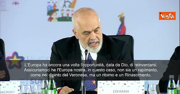 “Quando Donald Trump dice che Dio lo ha salvato dai proiettili perché l'Onnipotente aveva un piano per l'America, dice solo metà della verità. E l'altra metà è che Dio aveva un piano anche per l'Europa, e questo non potrebbe essere più ovvio. L'Europa ha ancora una volta l'opportunità, data da Dio, di reinventarsi. Assicuriamoci he l'Europa nostra, in questo caso, non sia un rapimento, come nel dipinto del Veronese, ma un ritorno e un Rinascimento. ". Lo ha detto il primo ministro albanese Edi Rama aprendo i lavori del vertice della Comunità politica europea a Tirana.