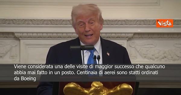 “Abbiamo fatto una visita straordinaria in Medio Oriente. Siamo andati in Qatar, diciamo in Arabia Saudita, con tutti i personaggi più influenti e negli Emirati Arabi Uniti, e abbiamo riportato circa 5,1 trilioni di dollari. E' forse una delle visite di maggior successo che qualcuno abbia mai fatto in un posto.” Così il Presidente degli Stati Uniti Donald Trump durante il suo intervento alla cena del consiglio di amministrazione del Kennedy Center
