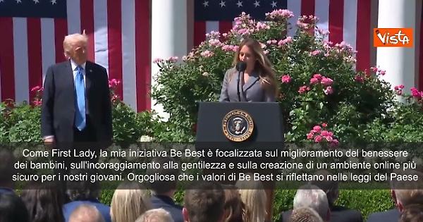 "Come First Lady, la mia iniziativa Be Best è focalizzata sul miglioramento del benessere dei bambini, sull'incoraggiamento alla gentilezza e sulla creazione di un ambiente online più sicuro per i nostri giovani. Orgogliosa che i valori di Be Best si riflettano nelle leggi del Paese", così Melania Trump in occasione della firma della legge contro il revenge porn nel Giardino delle Rose della Casa Bianca.