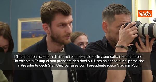 "L'Ucraina non accetterà di ritirare il suo esercito dalle zone sotto il suo controllo. Ho chiesto a Trump di non prendere decisioni sull'Ucraina senza di noi prima che il presidente degli Stati Uniti parlasse con il presidente russo Vladimir Putin". Lo ha detto il Presidente ucraino Zelensky.
