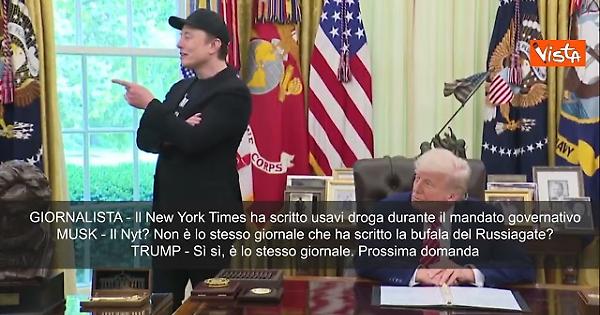 "Il New York Times ha scritto usavi droga durante il tuo mandato governativo al Doge, ha chiesto un cronista alla Casa Bianca a Elon Musk, che ha commentato: "Il Nyt? Non è lo stesso giornale che ha scritto la bufala del Russiagate?", a quel punto è intervenuto il Presidente Trump, che ha confermato: Sì sì, è lo stesso giornale. Prossima domanda".