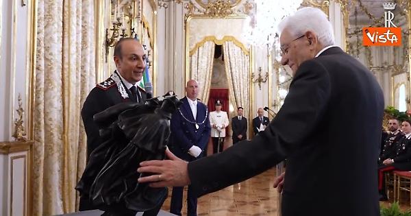 Il Presidente della Repubblica, Sergio Mattarella, in occasione del 211° anniversario di costituzione dell'Arma dei Carabinieri, ha ricevuto questa mattina al Quirinale il Generale C.A. Salvatore Luongo, Comandante Generale dell'Arma dei Carabinieri, accompagnato da una rappresentanza di appartenenti alla Forza Armata. Ecco la statuetta donata dall'Arma al Presidente, "Carabinieri nella tormenta".