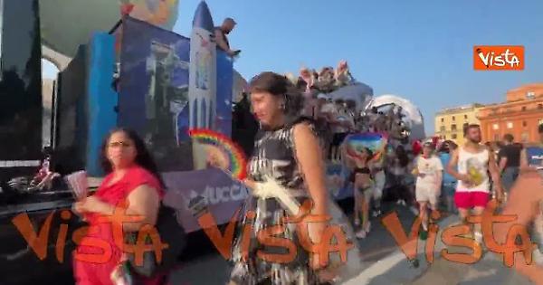 Si è tenuto a Roma, per le vie del centro l'annuale Roma Pride. Migliaia di persone sono scese in piazza seguendo i diversi carri. Ecco il passaggio del corteo nei pressi del Colosseo. Tra i carri che sono passagti anche quello del Muccassassina, abbellita da un mappamondo e da un missile.