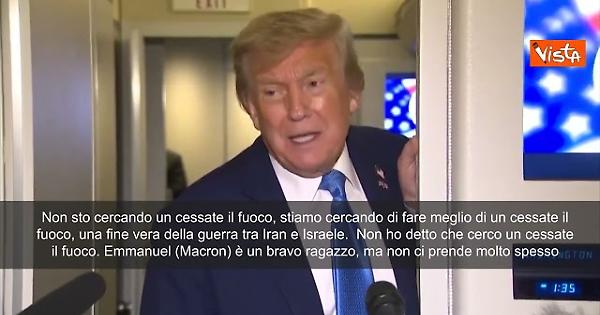 "Non sto cercando un cessate il fuoco, stiamo cercando di fare meglio di un cessate il fuoco, una fine vera della guerra tra Iran e Israele. Non ho detto che cerco un cessate il fuoco. Emmanuel (Macron) è un bravo ragazzo, ma non ci prende molto spesso”. Lo ha detto il presidente americano, Donald Trump parlando con i giornalisti a bordo dell'Air Force One dopo essere atterrato a Washington dal G7 in Canada.