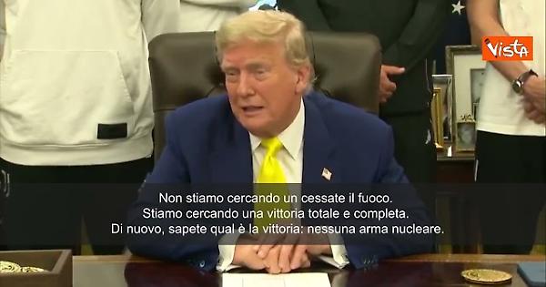 "Non stiamo cercando un cessate il fuoco. Stiamo cercando una vittoria totale e completa. Di nuovo, sapete qual è la vittoria: nessuna arma nucleare." Lo ha detto Trump parlando con i cronisti alla Casa Bianca.
