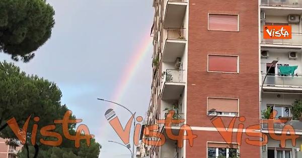 Le immagini dell’arcobaleno sulla via Prenestina direzione Castelli Romani a Roma apparso dopo un breve acquazzone nel pomeriggio.