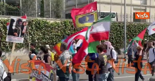 Manifestazione a Roma per la pace, ci sono anche bandiere dell'Iran e della Russia