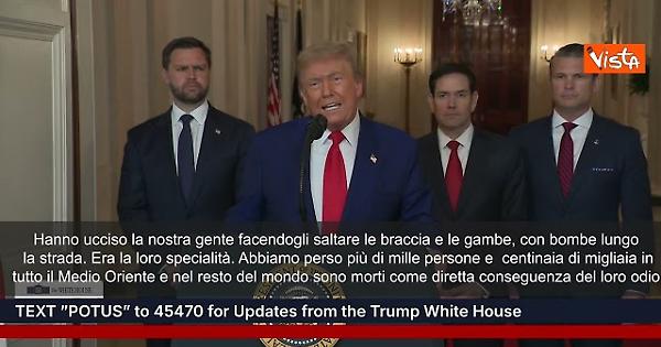 (Agenzia Vista) Usa, 22 giugno 2025 "Pochi minuti fa fa l'esercito Usa ha effettuato massicci attacchi di precisione sui tre principali impianti nucleari del regime iraniano nei pressi di Natanz ed Esfahan. Tutti hanno sentito questi nomi per anni, mentre si costruivano questi impianti orribilmente distruttivi. Il nostro obiettivo era la distruzione della capacità di arricchimento nucleare dell'Iran e lo stop alla minaccia nucleare posta dallo stato sponsor numero uno al mondo del terrorismo. Stasera posso riferire al mondo che gli attacchi sono stati un successo militare spettacolare. I principali impianti di arricchimento nucleare dell'Iran sono stati completamente e totalmente annientati. L'Iran deve ora fare la pace, altrimenti gli attacchi futuri saranno molto più devastanti. Da 40 anni l'Iran dice “morte all'America, morte a Israele”. Hanno ucciso la nostra gente facendogli saltare le braccia e le gambe, con bombe lungo la strada. Era la loro specialità. Abbiamo perso più di mille persone e centinaia di migliaia in tutto il Medio Oriente e nel resto del mondo sono morti come diretta conseguenza del loro odio. In particolare tanti sono stati uccisi da loro generale Qasem Soleimani, che ho deciso molto tempo fa di eliminare. Voglio ringraziare e congratularmi con il premier Bibi Netanyahu, abbiamo lavorato come una squadra, come forse nessuna squadra ha mai funzionato prima. C’è molta strada da fare per eliminare questa orribile minaccia contro Israele voglio ringraziare i militari israeliani per lo splendido lavoro che hanno fatto e soprattutto voglio congratularmi con i grandi patrioti americani che pilotavano quelle magnifiche macchine. Un'operazione del genere il mondo non l'ha mai vista per molti decenni e si spera, non ne avremo più bisogno. Voglio congratularmi con il Capo di Stato Maggiore Generale Dan Razin Caine e tutte le brillanti menti militari coinvolte. Adesso ci dovrà essere la pace o ci sarà una tragedia per l’Iran molto più grande di quella a cui avete assistito negli ultimi otto giorni. Ci sono molti obiettivi rimasti. L'operazione di stasera è stata la più difficile e forse la più letale, ma se la pace non arriva rapidamente noi inseguiremo gli altri obiettivi con precisione, velocità e abilità. La maggior parte di questi obiettivi possono essere aggiunti in pochi minuti. Domani il generale Kaine e il segretario Hegseth terranno una conferenza stampa. Grazie, Dio benedica Israele e Dio benedica l'America". Lo ha detto Donald Trump alla Casa Bianca dopo l'attacco contro l'Iran. White House Fonte: Agenzia Vista / Alexander Jakhnagiev