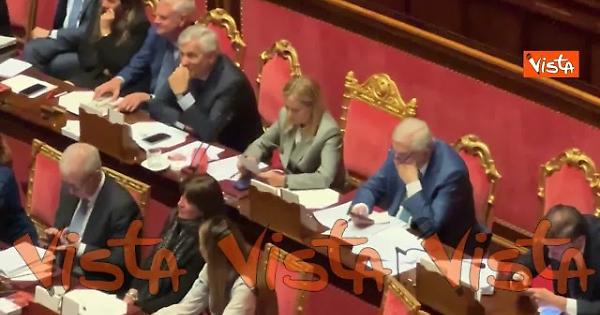 La premier Meloni, in Aula al Senato per la discussione sul prossimo Consiglio Ue, legge un biglietto, poi lo piega in due.